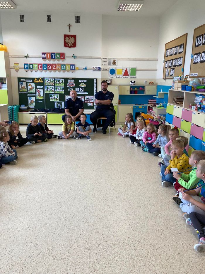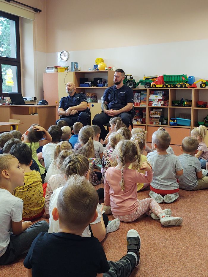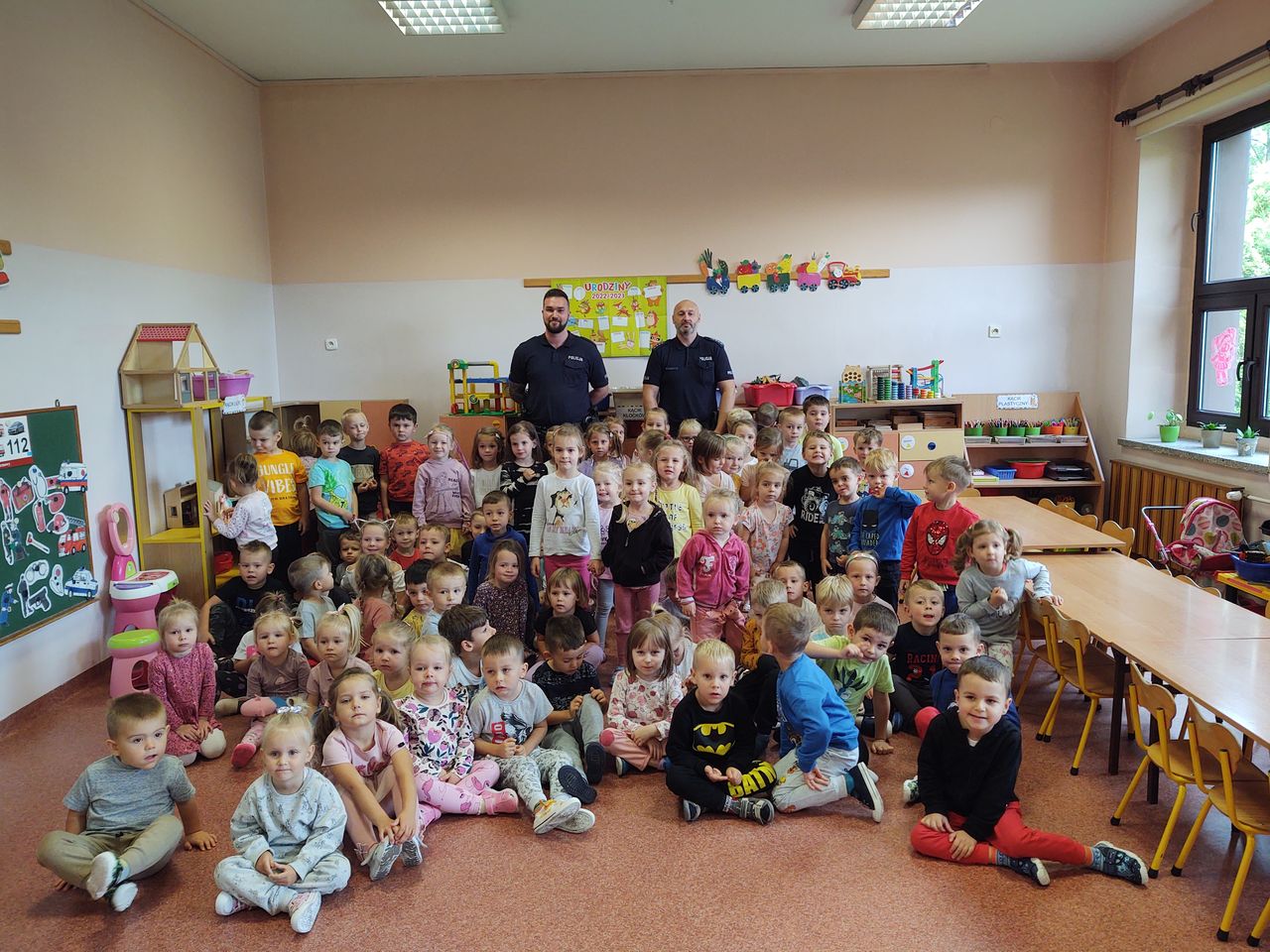19 września w naszym przedszkolu odbyło się spotkanie z policjantami z Komendy Powiatowej Policji w Oświęcimiu. Tematem spotkania było utrwalenie z dziećmi zasad bezpiecznego zachowania się na drodze oraz przypomnienie zagadnień dotyczących bezpieczeństwa dzieci zarówno w przedszkolu, jak i w domu. Policjanci wytłumaczyli przedszkolakom jak należy zachować się w kontaktach z obcymi ludźmi, a także jak dbać o bezpieczeństwo własne i innych. Na koniec panowie zaprezentowali dzieciom swój służbowy strój oraz akcesoria. Przedszkolaki z dużym zainteresowaniem słuchały wskazówek zaproszonych gości, a teraz z niecierpliwością czekają na kolejne spotkanie.