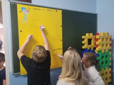 Na szkolnych korytarzach pojawiły się również plakaty, na których uczniowie mogli zapisywać swoje sposoby radzenia sobie z emocjami. W ten sposób powstała wspólna mapa dobrych praktyk i pomysłów na lepsze samopoczucie każdego dnia. Dzień ten był nie tylko okazją do zabawy, ale też do refleksji i rozmowy o emocjach – tych przyjemnych i trudnych. Dziękujemy wszystkim za zaangażowanie i wspólne tworzenie przestrzeni, w której każdy może czuć się dobrze i bezpiecznie!
