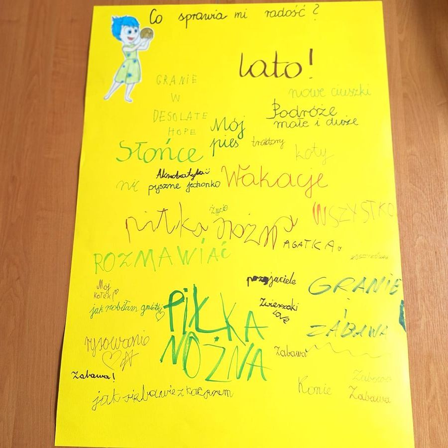 Na szkolnych korytarzach pojawiły się również plakaty, na których uczniowie mogli zapisywać swoje sposoby radzenia sobie z emocjami. W ten sposób powstała wspólna mapa dobrych praktyk i pomysłów na lepsze samopoczucie każdego dnia. Dzień ten był nie tylko okazją do zabawy, ale też do refleksji i rozmowy o emocjach – tych przyjemnych i trudnych. Dziękujemy wszystkim za zaangażowanie i wspólne tworzenie przestrzeni, w której każdy może czuć się dobrze i bezpiecznie!