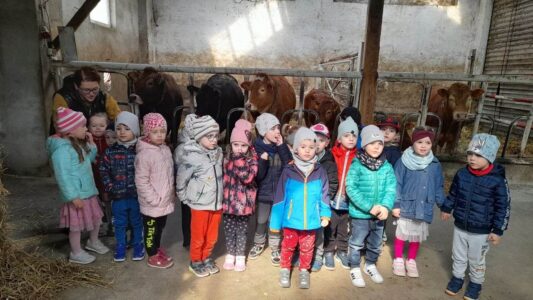 Grupa Misiów, realizując temat kompleksowy „Zwierzęta w gospodarstwie wiejskim” odwiedziła gospodarstwo państwa Baścików. Dzieci były zachwycone oglądając z bliska krowy i cielątka. Dodatkową atrakcją, zwłaszcza dla chłopców, były maszyny rolnicze. Po powrocie do przedszkola, dzieci z zainteresowaniem uczestniczyły w zajęciach, podczas których poznawały produkty pochodzące od krów, kur i innych zwierząt. (Na zdjęciach zajęcia – „Jajka w różnych postaciach”)