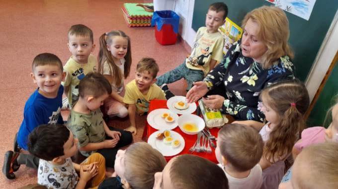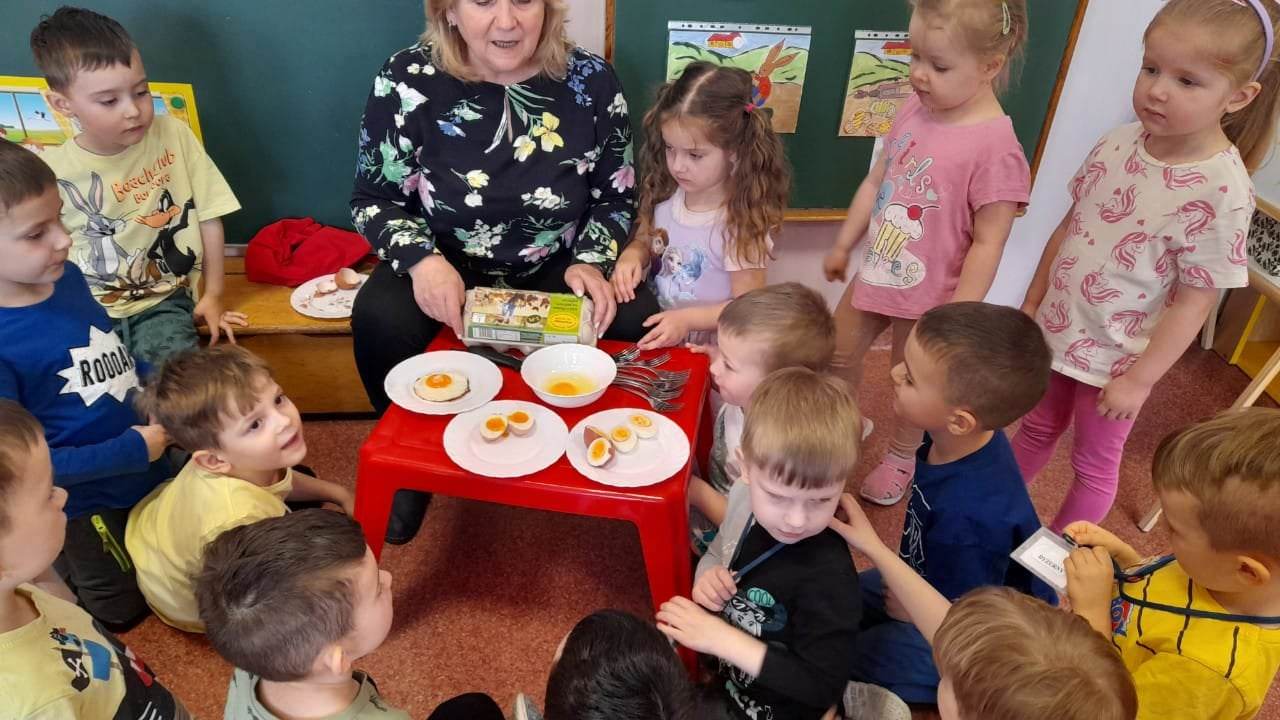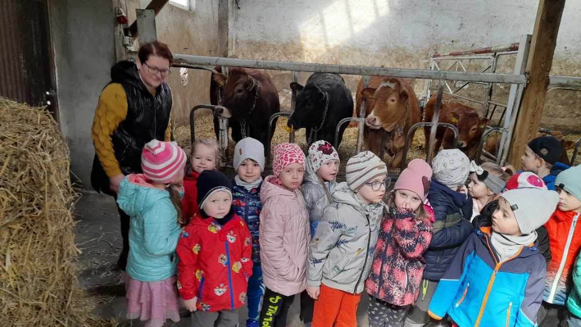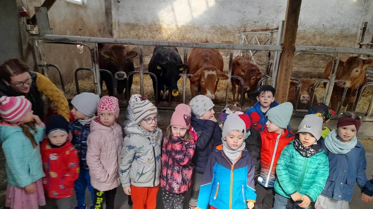 Grupa Misiów, realizując temat kompleksowy „Zwierzęta w gospodarstwie wiejskim” odwiedziła gospodarstwo państwa Baścików. Dzieci były zachwycone oglądając z bliska krowy i cielątka. Dodatkową atrakcją, zwłaszcza dla chłopców, były maszyny rolnicze. Po powrocie do przedszkola, dzieci z zainteresowaniem uczestniczyły w zajęciach, podczas których poznawały produkty pochodzące od krów, kur i innych zwierząt. (Na zdjęciach zajęcia – „Jajka w różnych postaciach”)
