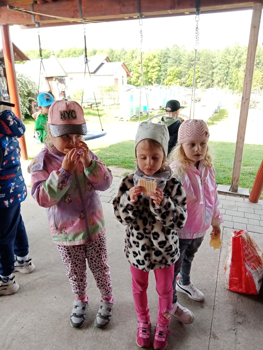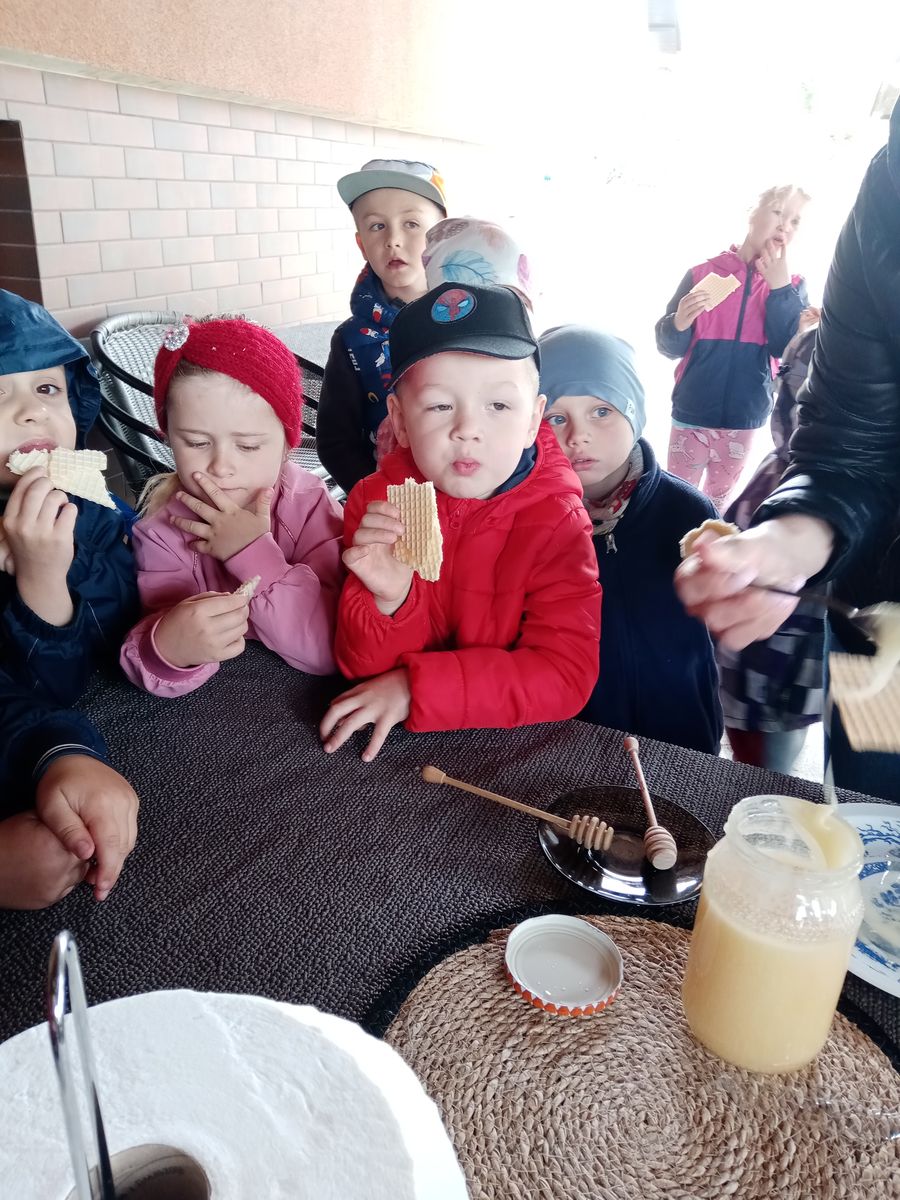 Po części edukacyjnej, pan Tadeusz poczęstował dzieci miodem z własnej pasieki. Miód smakował dzieciom wyśmienicie, z radością próbowały go z chrupiącymi wafelkami. Wizyta w pasiece była dla przedszkolaków nie tylko pouczająca, ale również bardzo przyjemna, pełna wrażeń i fascynujących informacji, które na długo pozostaną w ich pamięci.