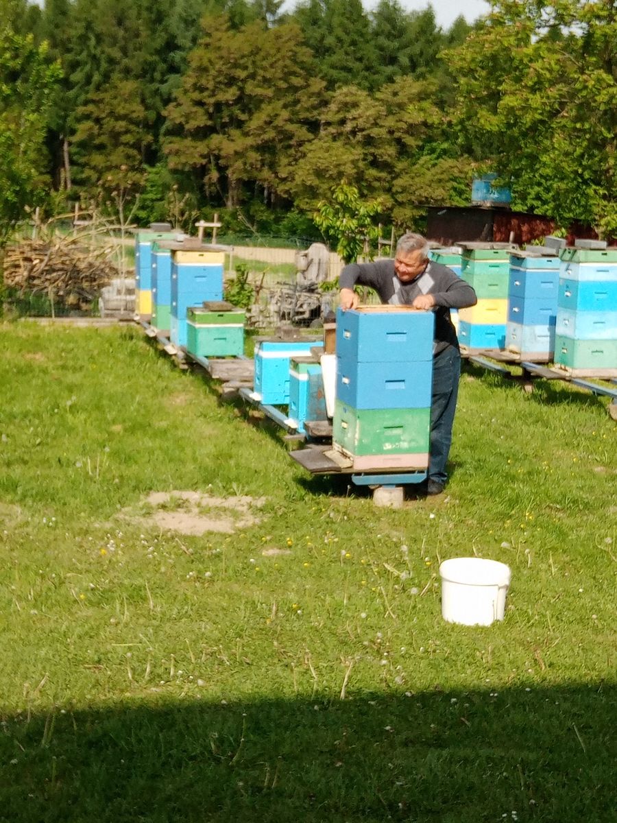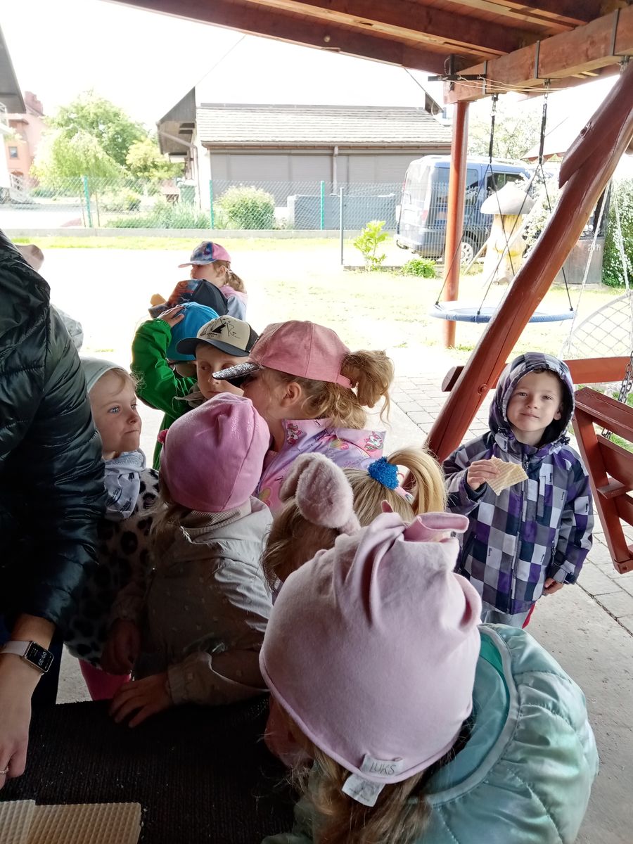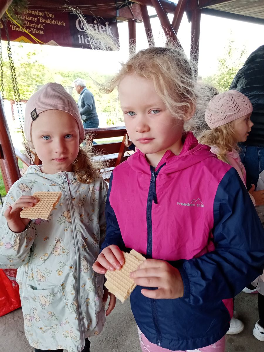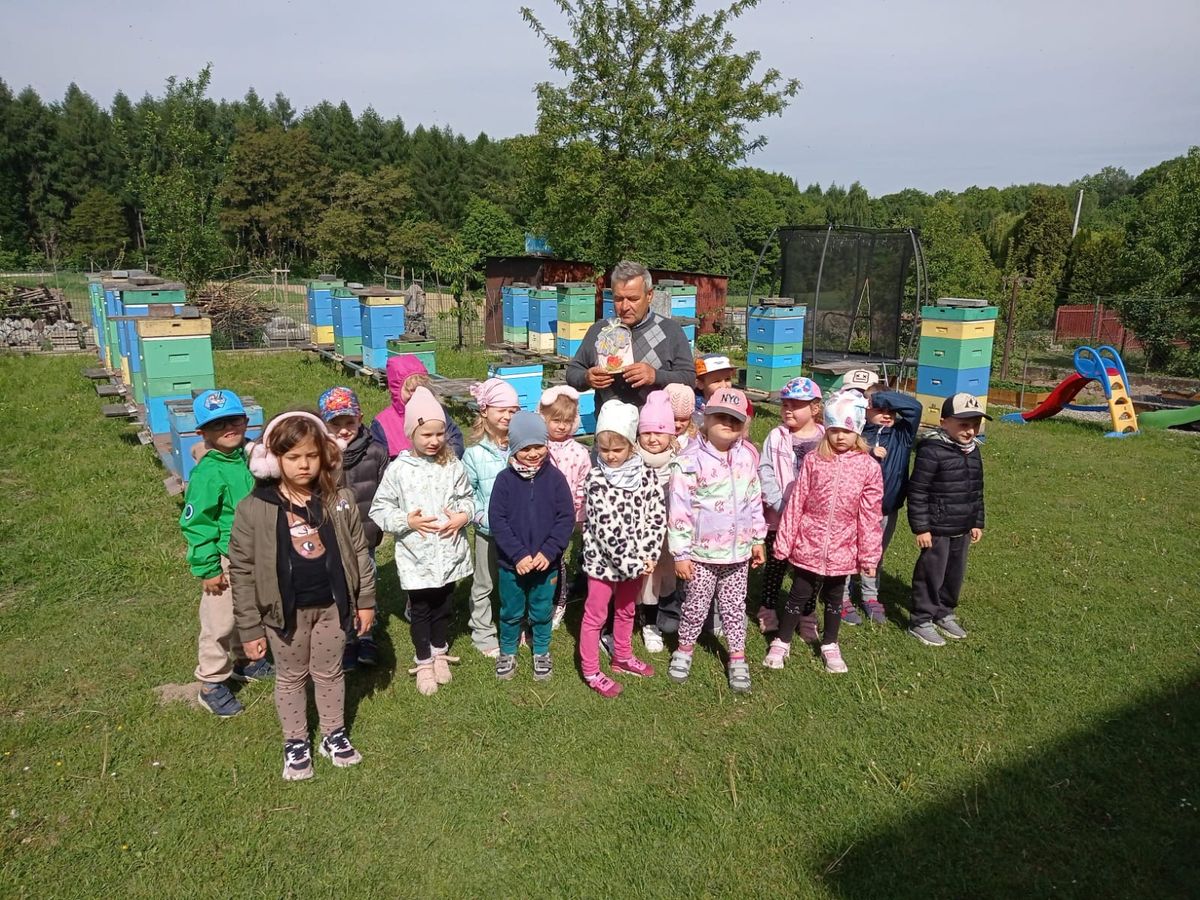14 maja przedszkolaki wybrały się na wycieczkę do pasieki pana Tadeusza Bąbacza. Już od samego wejścia na miejsce dzieci były podekscytowane i ciekawe, co je czeka. Pan Tadeusz przywitał je serdecznie i zaczął opowiadać o pszczołach – o ich roli w przyrodzie, jak pracują w ulu oraz jak ważne są dla naszego życia. Następnie pan Tadeusz pokazał dzieciom ul, w którym znajdowały się pszczoły. Opowiadał, jak wygląda życie pszczół, czym się różnią robotnice od królowej i trutni. Dzieci miały okazję zobaczyć, jak wygląda plaster miodu, a także dowiedziały się, jak pszczelarz dba o swoje pszczoły.