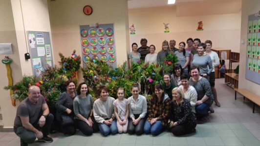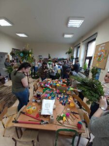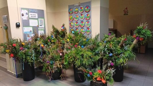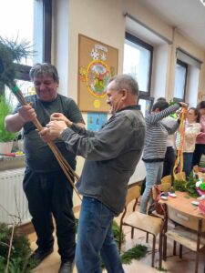 Z tej właśnie okazji 13 marca w naszym przedszkolu odbyły się Wielkanocne Warsztaty. Podczas, których nauczyciele naszego przedszkola wraz z rodzicami, dziadkami oraz reprezentantami chóru „Osieczanie”z przygotowanych różnorodnych materiałów plastycznych wykonali piękne wielkanocne palmy. Wszyscy wykazali się dużą kreatywnością, pomysłowością oraz inwencją twórczą. Dzięki talentom artystycznym przybyłych gości powstały piękne, kolorowe, pachnące palmy, które można było zakupić dla swoich pociech. Palmy cieszyły się dużym zainteresowaniem, już pierwszego dnia sprzedaży rozchodziły się jak świeże bułeczki.
