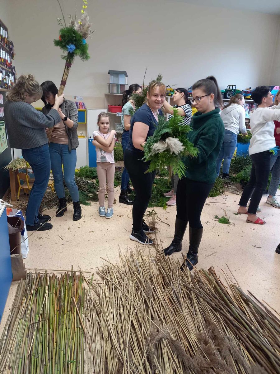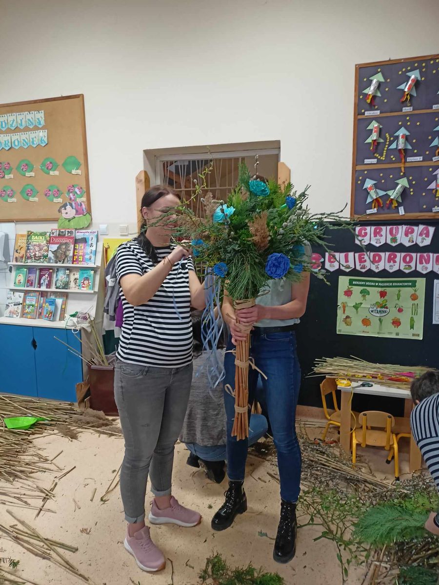 Z tej właśnie okazji 13 marca w naszym przedszkolu odbyły się Wielkanocne Warsztaty. Podczas, których nauczyciele naszego przedszkola wraz z rodzicami, dziadkami oraz reprezentantami chóru „Osieczanie”z przygotowanych różnorodnych materiałów plastycznych wykonali piękne wielkanocne palmy. Wszyscy wykazali się dużą kreatywnością, pomysłowością oraz inwencją twórczą. Dzięki talentom artystycznym przybyłych gości powstały piękne, kolorowe, pachnące palmy, które można było zakupić dla swoich pociech. Palmy cieszyły się dużym zainteresowaniem, już pierwszego dnia sprzedaży rozchodziły się jak świeże bułeczki.