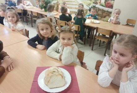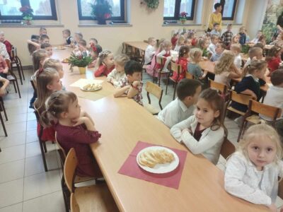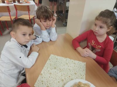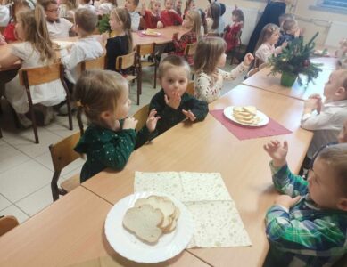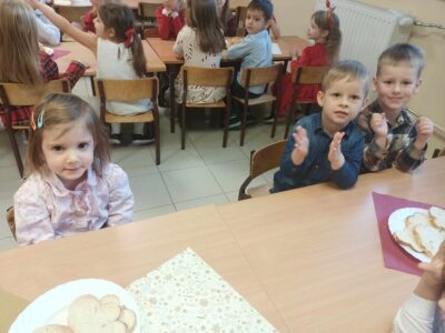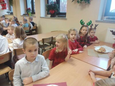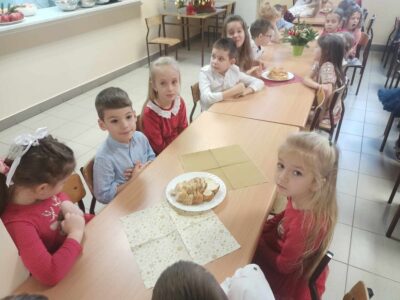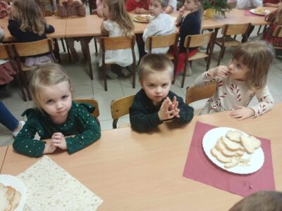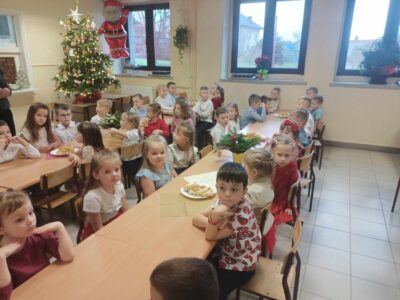 20 grudnia w naszym przedszkolu obchodziliśmy jeden z najpiękniejszych dni w roku – Wigilię Bożego Narodzenia. W ten szczególny dzień panowała ożywiona atmosfera. Świąteczne dekoracje oraz dzieci w eleganckich strojach wprowadzały nastrój oczekiwania na wyjątkowe, niecodzienne wydarzenie. Uroczystość rozpoczęły wspólne życzenia oraz kolędowanie. Na stole pojawiły się tradycyjne świąteczne przysmaki. Był to czas pełen radości.