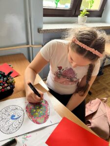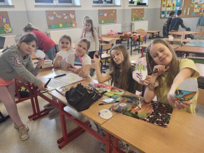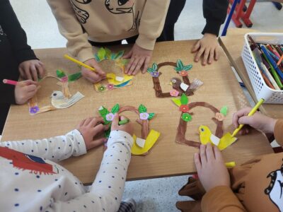 Uczniowie uczęszczający na zajęcia do świetlicy szkolnej przywitali wiosnę, tworząc kolorowe prace plastyczne. Powstały przestrzenne motyle i kwiaty. Nie zabrakło też przylatujących bocianów i wielobarwnych ptaków. Dzieci przygotowywały się  do Świąt Wielkanocnych. Wspólnie z nauczycielami stworzyły kartki świąteczne, które podarowały pracownikom szkoły.