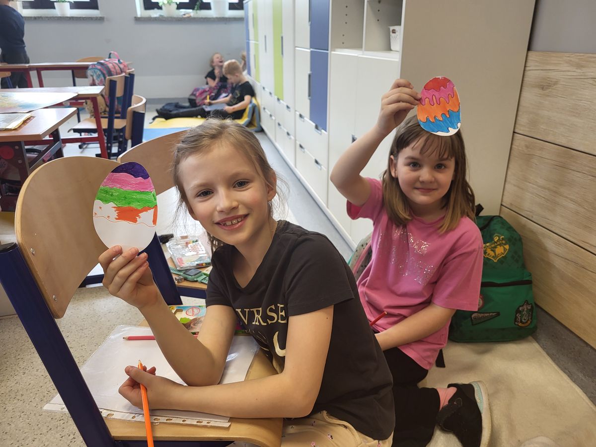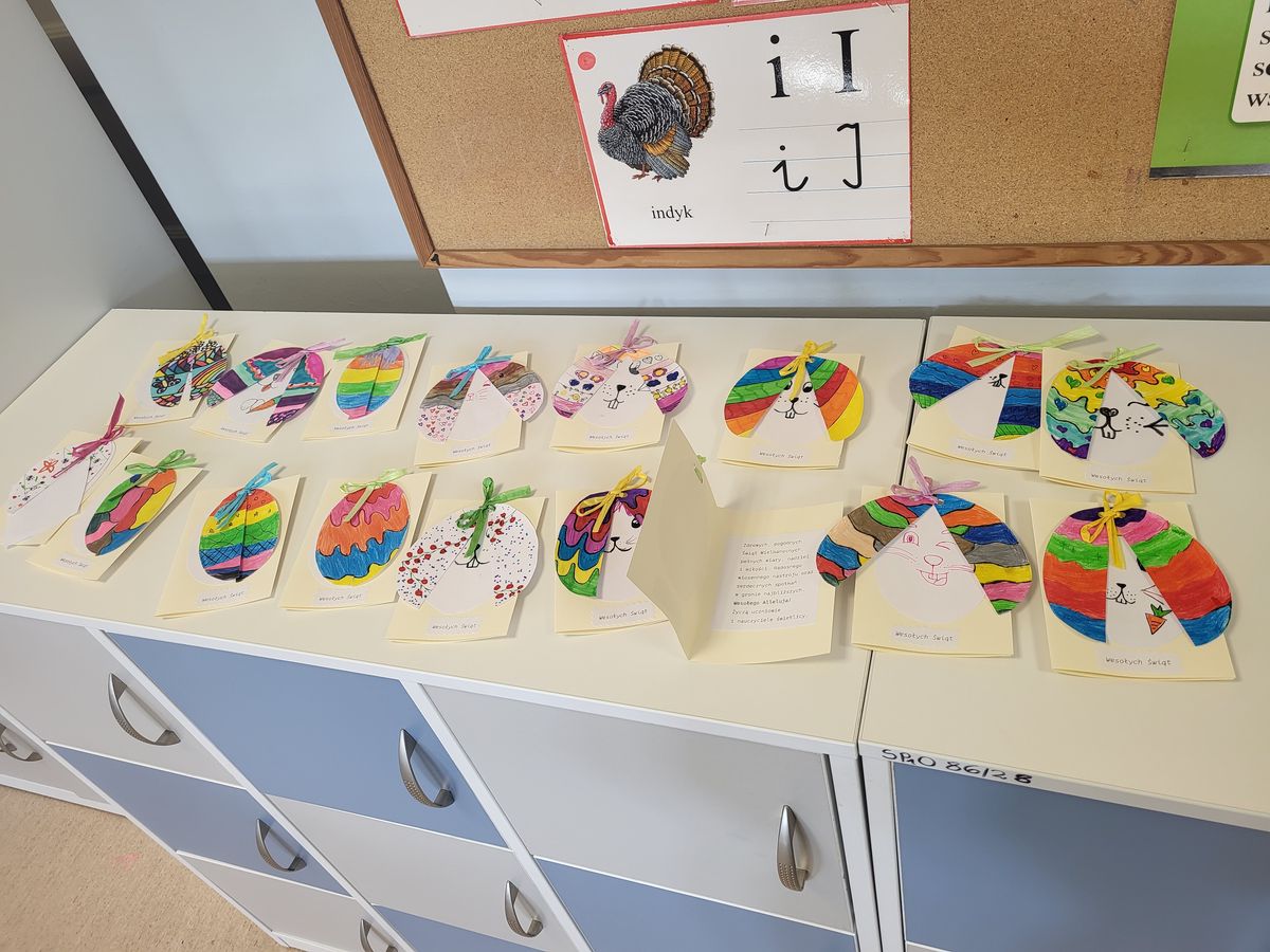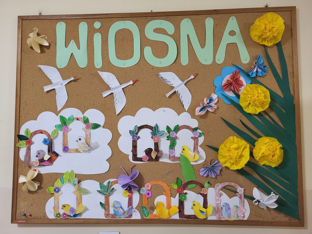 Uczniowie uczęszczający na zajęcia do świetlicy szkolnej przywitali wiosnę, tworząc kolorowe prace plastyczne. Powstały przestrzenne motyle i kwiaty. Nie zabrakło też przylatujących bocianów i wielobarwnych ptaków. Dzieci przygotowywały się  do Świąt Wielkanocnych. Wspólnie z nauczycielami stworzyły kartki świąteczne, które podarowały pracownikom szkoły.