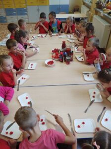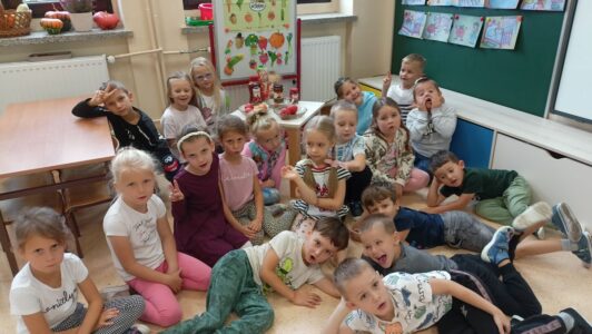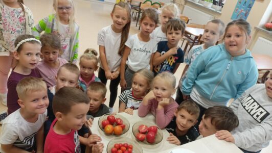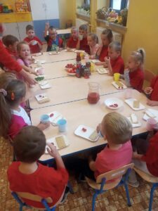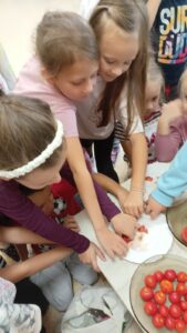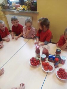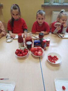 W miesiącu październiku pierwszym nowo poznanym bohaterem był :pomidor. Dzieci zapoznały się z różnymi odmianami pomidorów,ochoczo kosztowały i porównywały ich smaki. Przedszkolaki dowiedziały co z pomidorów można zrobić. Z największym zaciekawieniem próbowały soku pomidorowego, natomiast największym powodzeniem cieszył się ketchup. Dzieci wykleiły również naszego bohatera z kolorowego papieru.