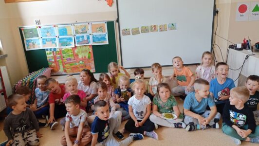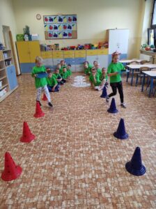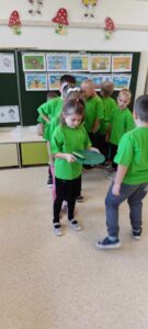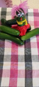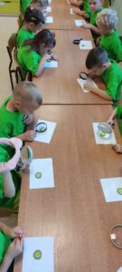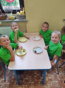 Kolejnym bohaterem tego miesiąca był ogórek. Przedszkolaki wzięły ogórka „pod lupę”, następnie skosztowały surowego,marynowanego i w musztardzie. Dzieci próbowały wymienić co z ogórka możemy zrobić. Podzieliły się swoją opinią w jakiej postaci lubią ogórka najbardziej. Pokonały z ogórkiem tor przeszkód, a gdy się zmęczyły wykonały z ogórka okład na zmęczone oczy i wypoczywały przy muzyce relaksacyjnej.