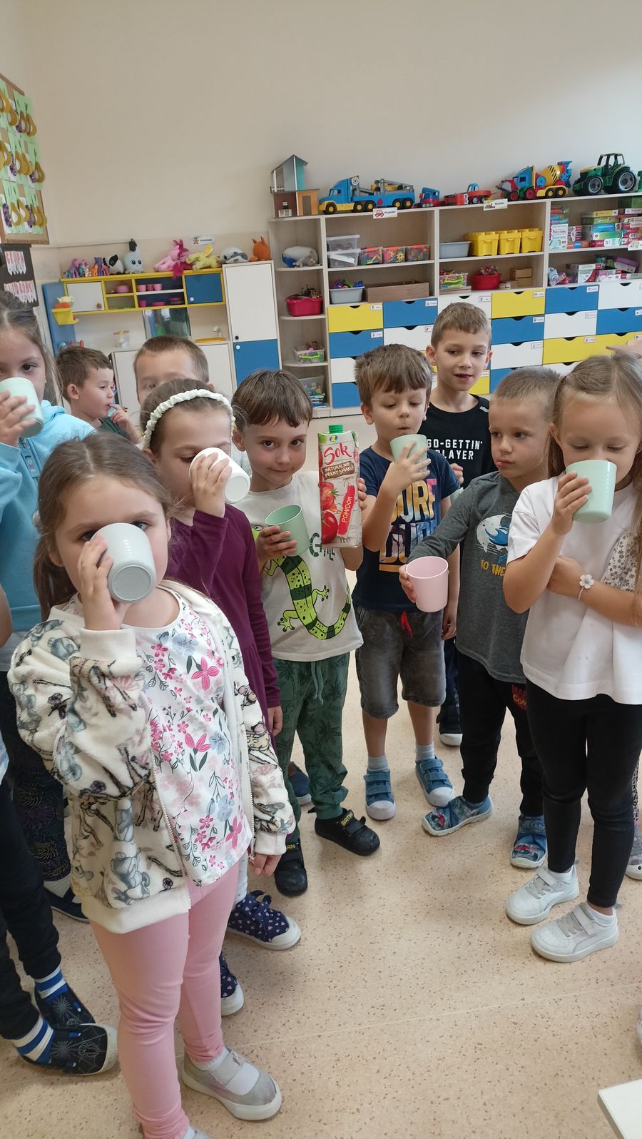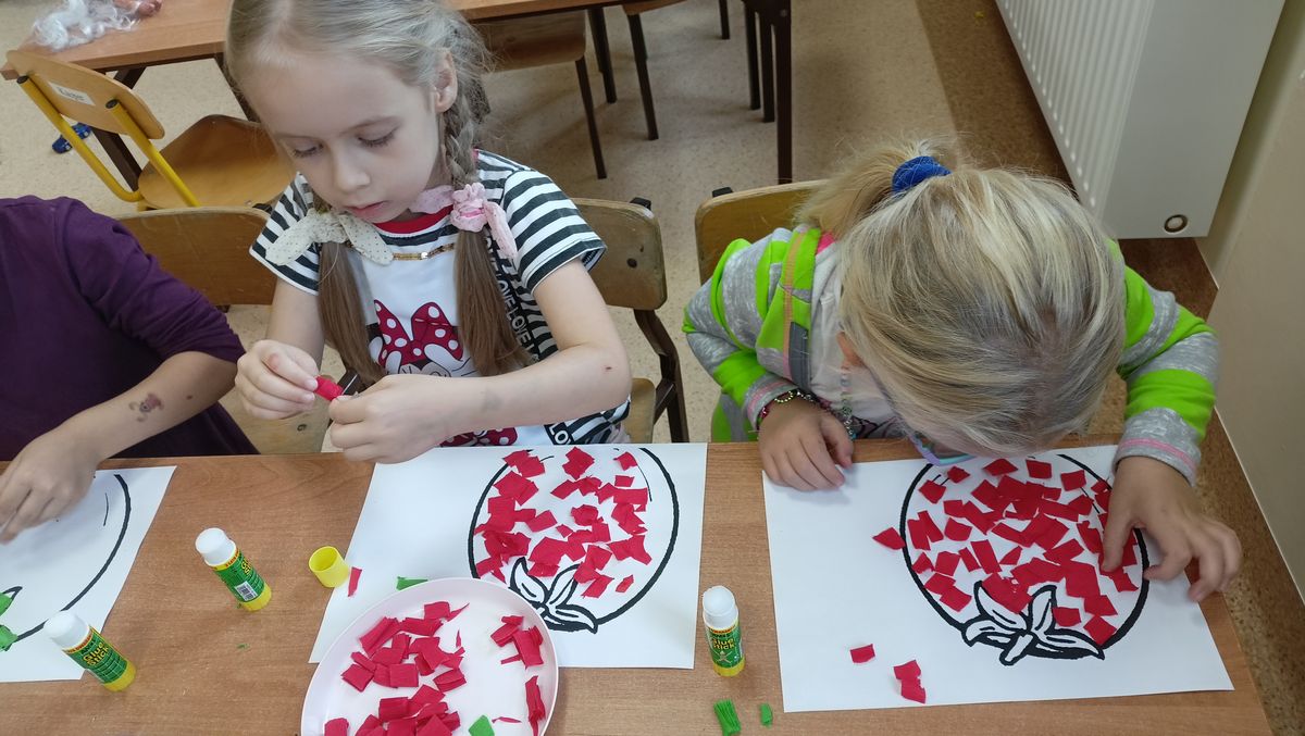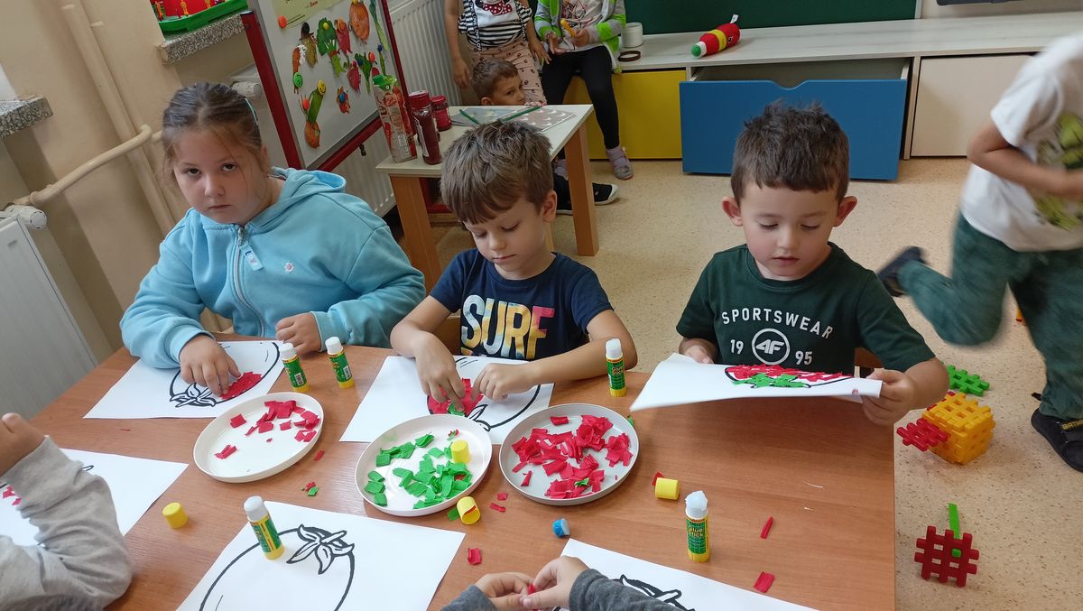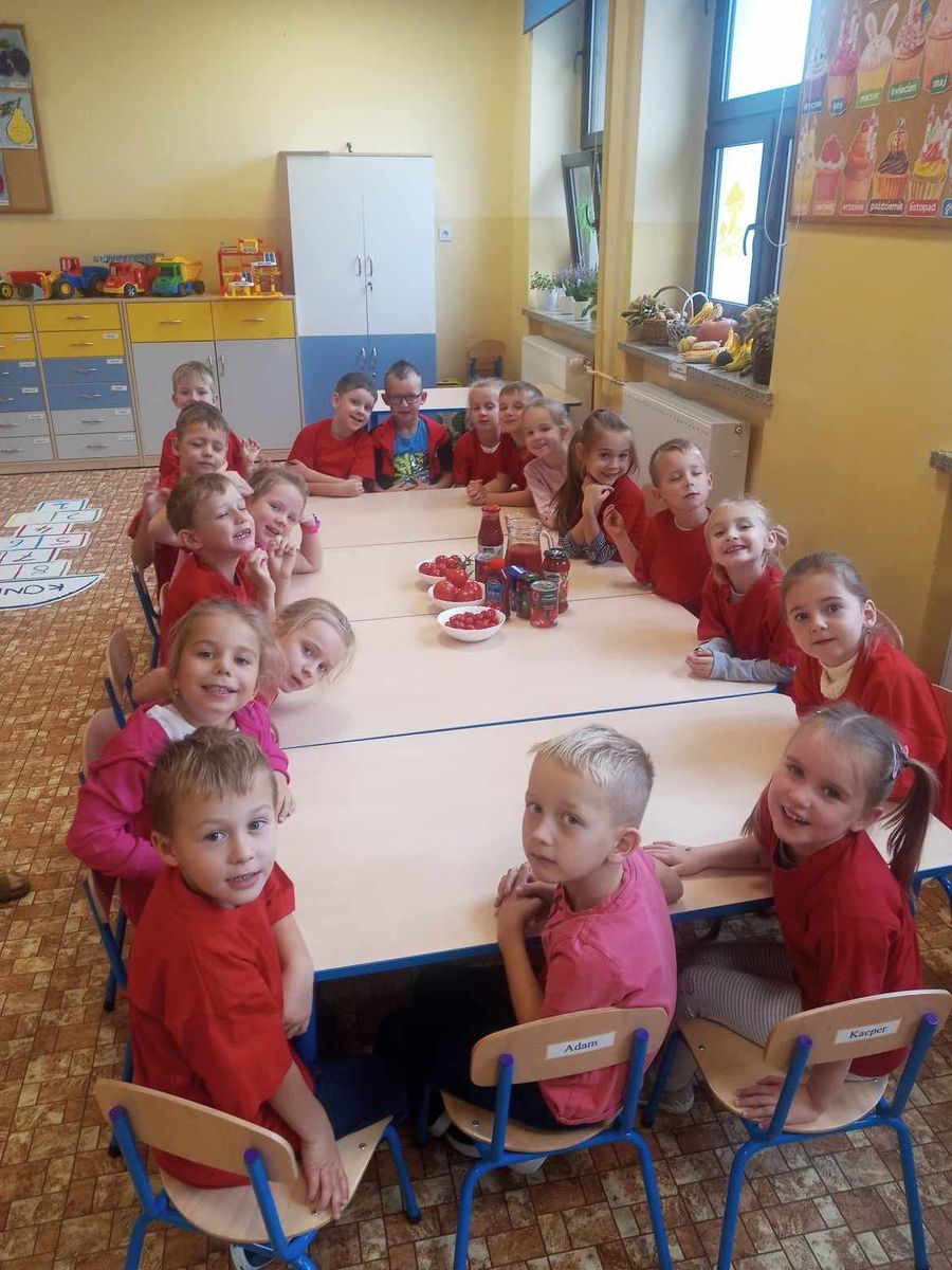 W miesiącu październiku pierwszym nowo poznanym bohaterem był :pomidor. Dzieci zapoznały się z różnymi odmianami pomidorów,ochoczo kosztowały i porównywały ich smaki. Przedszkolaki dowiedziały co z pomidorów można zrobić. Z największym zaciekawieniem próbowały soku pomidorowego, natomiast największym powodzeniem cieszył się ketchup. Dzieci wykleiły również naszego bohatera z kolorowego papieru.