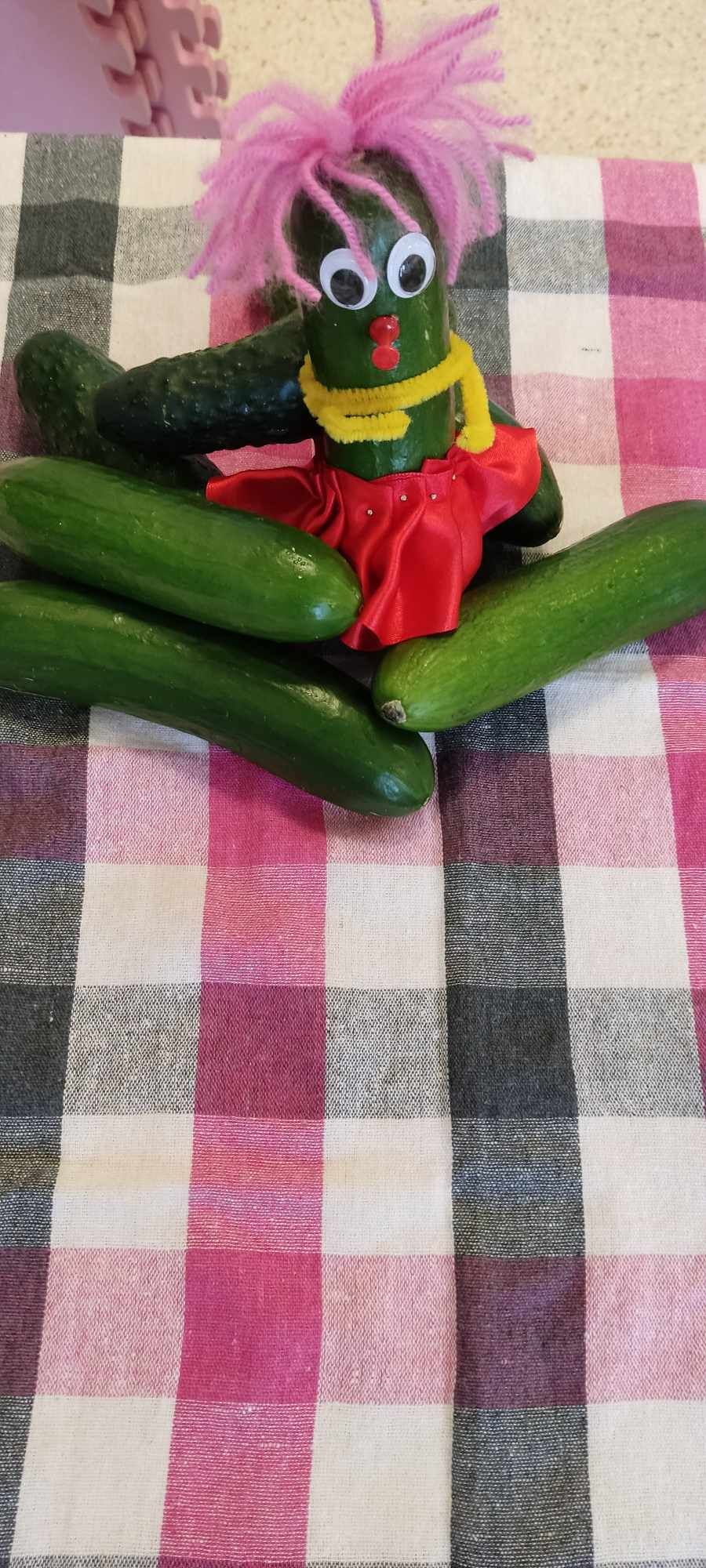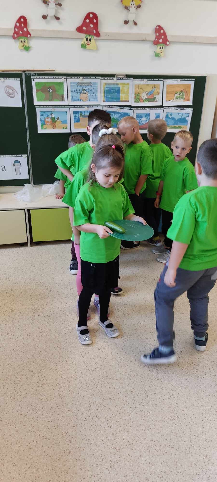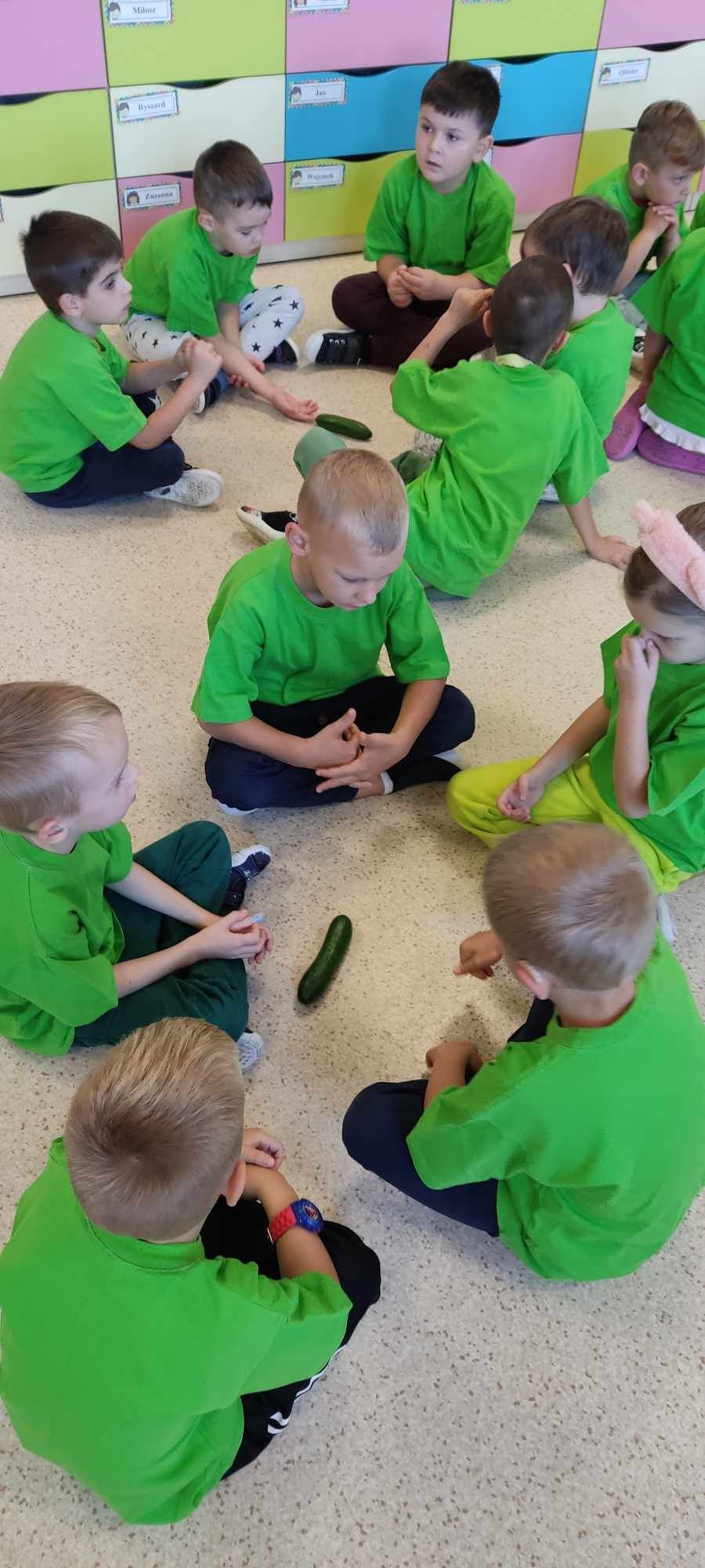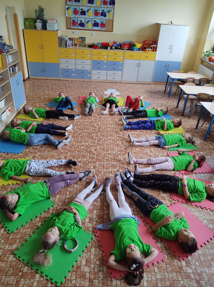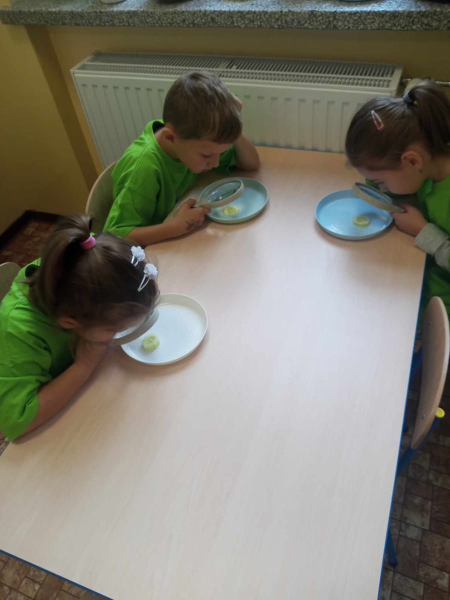 Kolejnym bohaterem tego miesiąca był ogórek. Przedszkolaki wzięły ogórka „pod lupę”, następnie skosztowały surowego,marynowanego i w musztardzie. Dzieci próbowały wymienić co z ogórka możemy zrobić. Podzieliły się swoją opinią w jakiej postaci lubią ogórka najbardziej. Pokonały z ogórkiem tor przeszkód, a gdy się zmęczyły wykonały z ogórka okład na zmęczone oczy i wypoczywały przy muzyce relaksacyjnej.