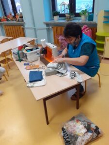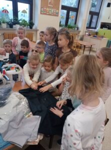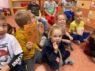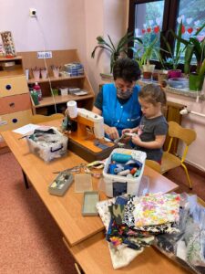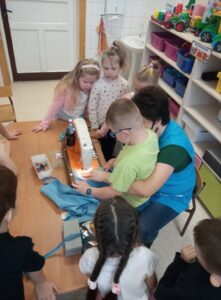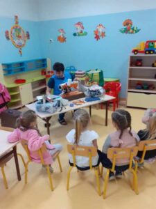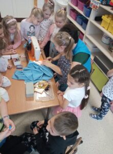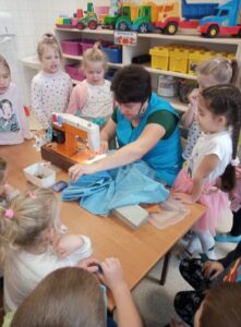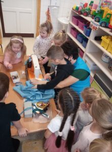 W ubiegłym tygodniu dzieci z naszego przedszkola poznały nowy zawód- krawcową. Z tej okazji niektóre grupy miały okazję gościć u siebie na zajęcia panią Marzenkę, która pracuje w naszym przedszkolu. Przedszkolaki oraz nauczyciele już nie raz mieli okazję podziwiać talent krawiecki naszej krawcowej. Tym razem każda z grup otrzymała uszytą torebkę na zakupy, którą dzieci będą mogły wykorzystać w czasie zabawy. Oprócz samego szycia, dzieci mogły poznać jakimi narzędziami posługuję się krawcowa na co dzień, poznały ich nazwy, mogły wszystkiego dotknąć. Starszaki z grupy Motylków ośmieliły się nawet zasiąść przy maszynie i szyć wspólnie z panią Marzenką. Bardzo dziękujemy pani krawcowej za wizytę i piękne podarunki.