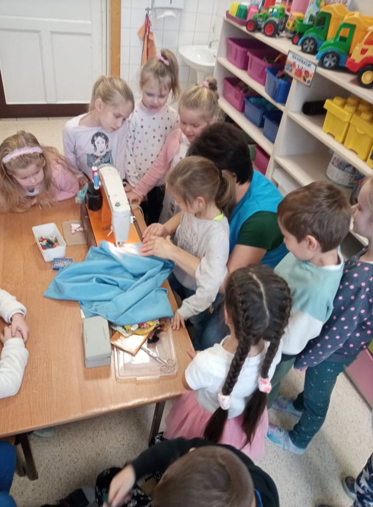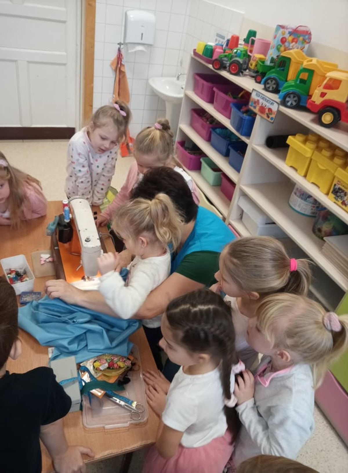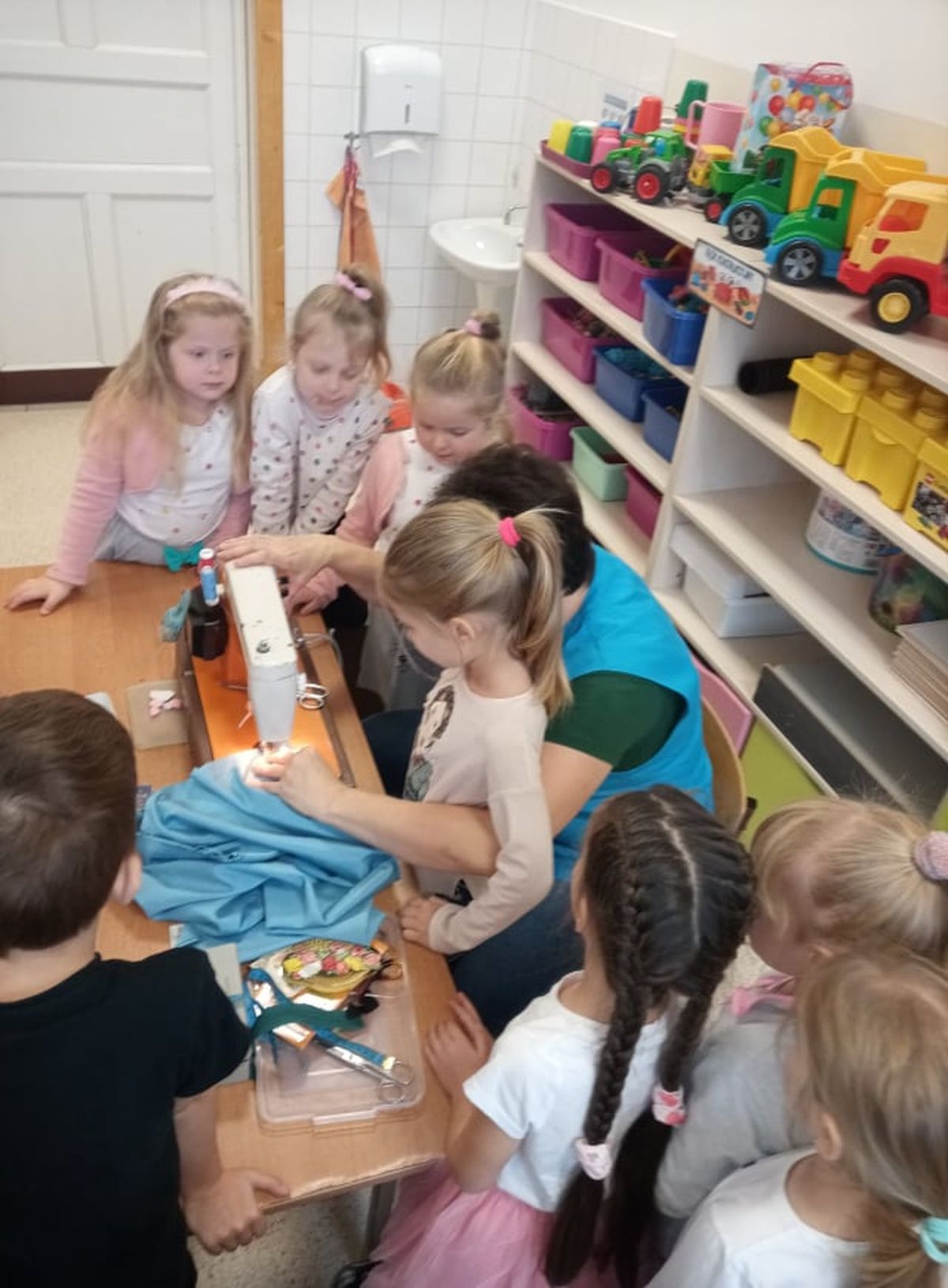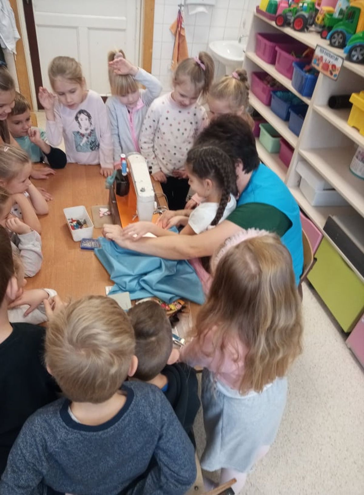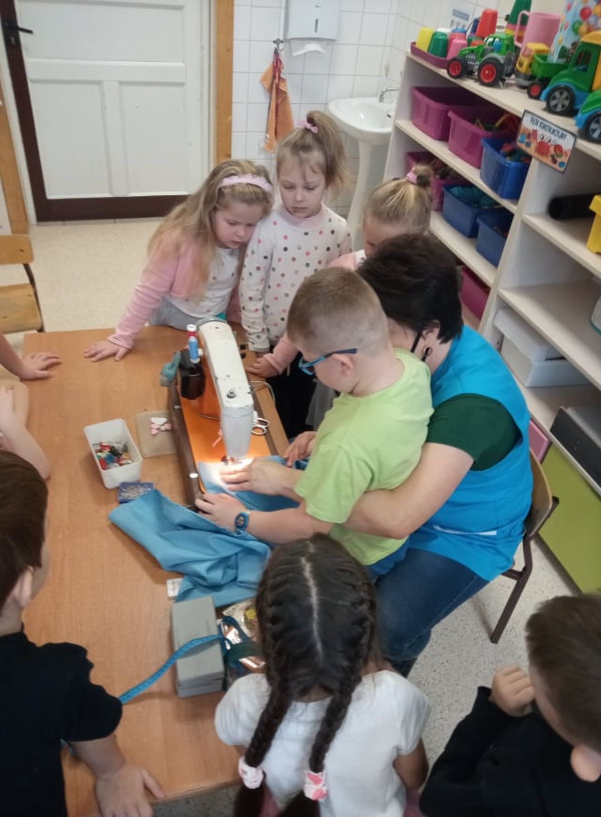 W ubiegłym tygodniu dzieci z naszego przedszkola poznały nowy zawód- krawcową. Z tej okazji niektóre grupy miały okazję gościć u siebie na zajęcia panią Marzenkę, która pracuje w naszym przedszkolu. Przedszkolaki oraz nauczyciele już nie raz mieli okazję podziwiać talent krawiecki naszej krawcowej. Tym razem każda z grup otrzymała uszytą torebkę na zakupy, którą dzieci będą mogły wykorzystać w czasie zabawy. Oprócz samego szycia, dzieci mogły poznać jakimi narzędziami posługuję się krawcowa na co dzień, poznały ich nazwy, mogły wszystkiego dotknąć. Starszaki z grupy Motylków ośmieliły się nawet zasiąść przy maszynie i szyć wspólnie z panią Marzenką. Bardzo dziękujemy pani krawcowej za wizytę i piękne podarunki.