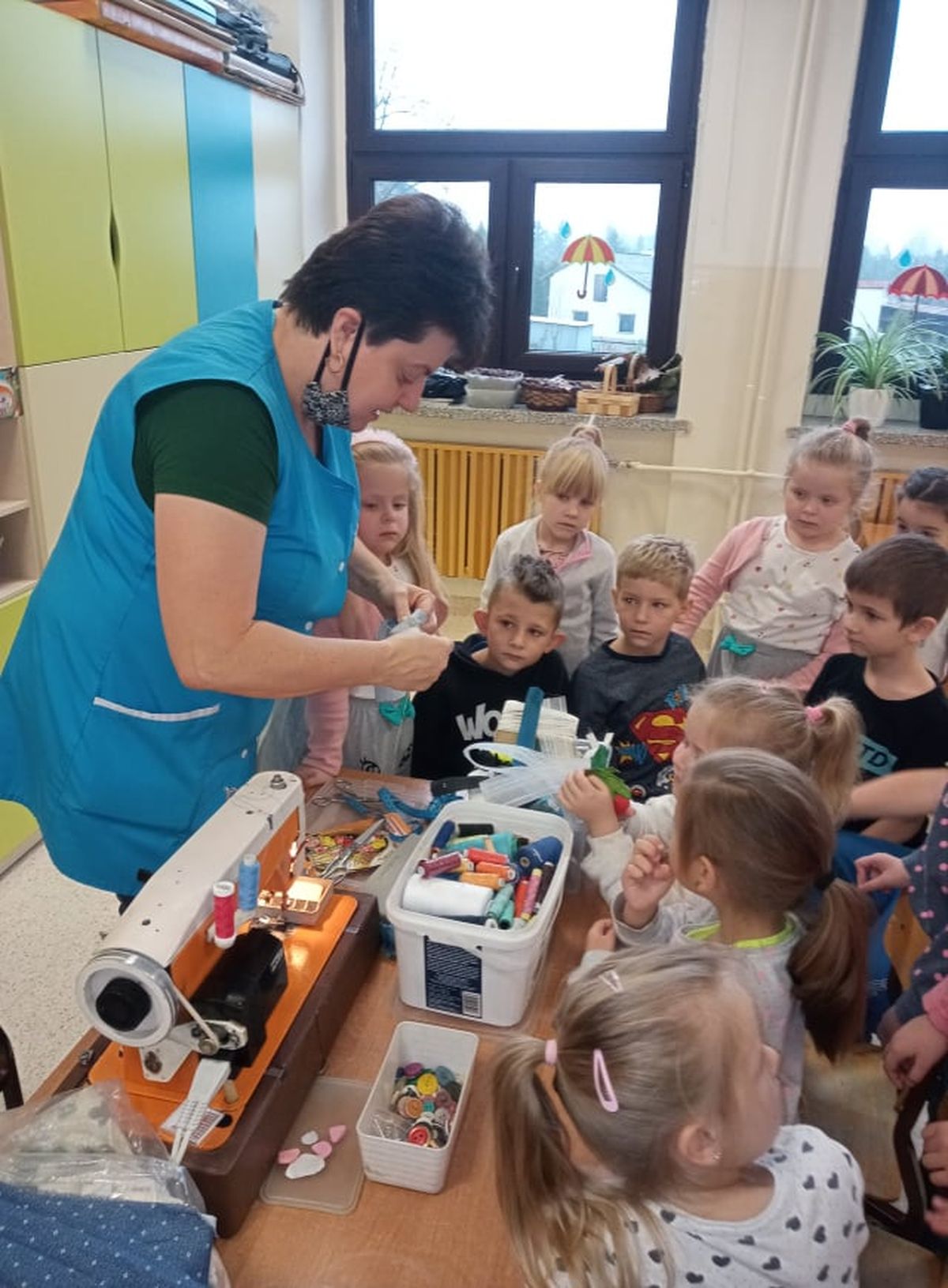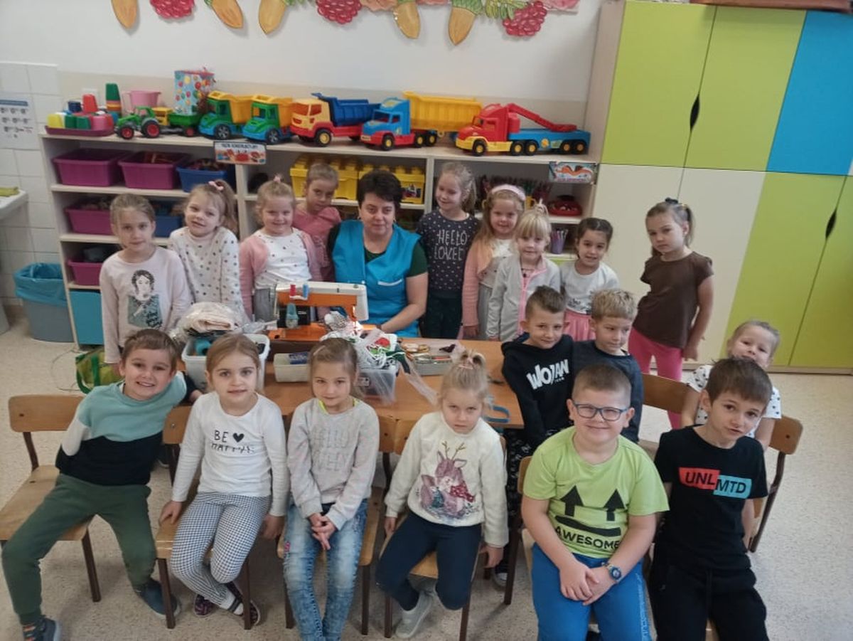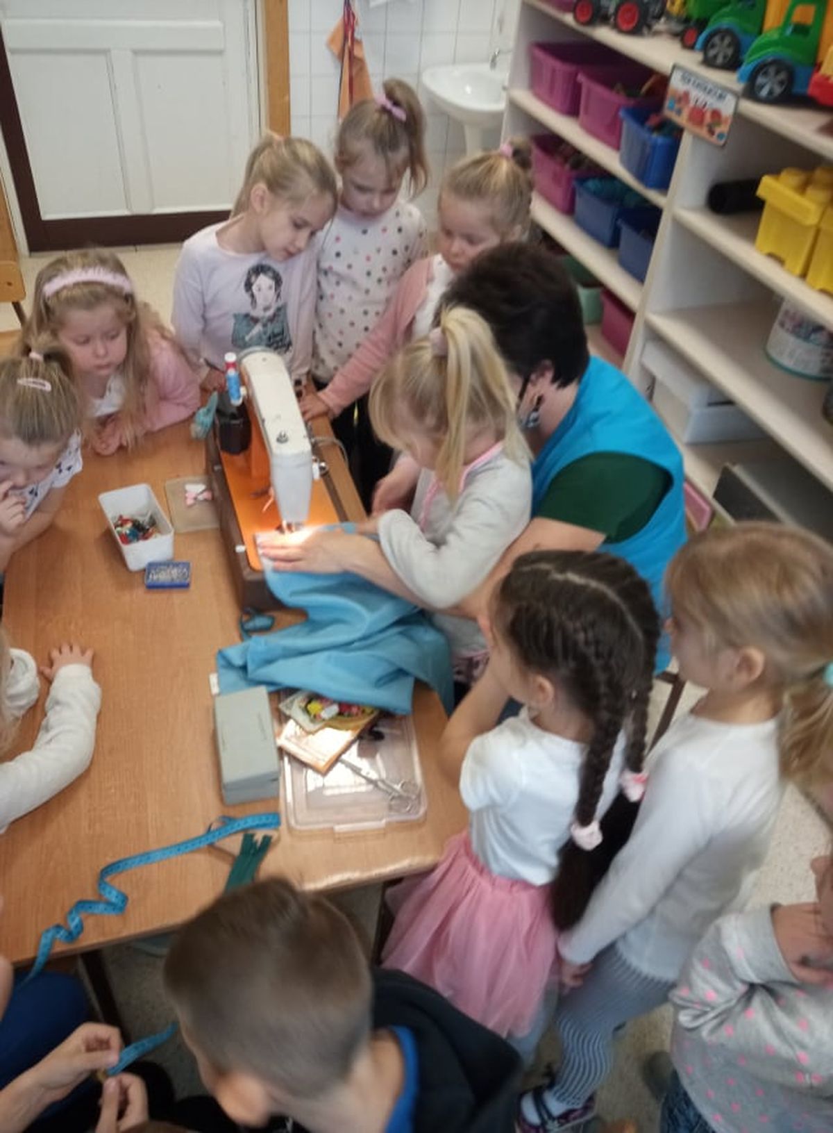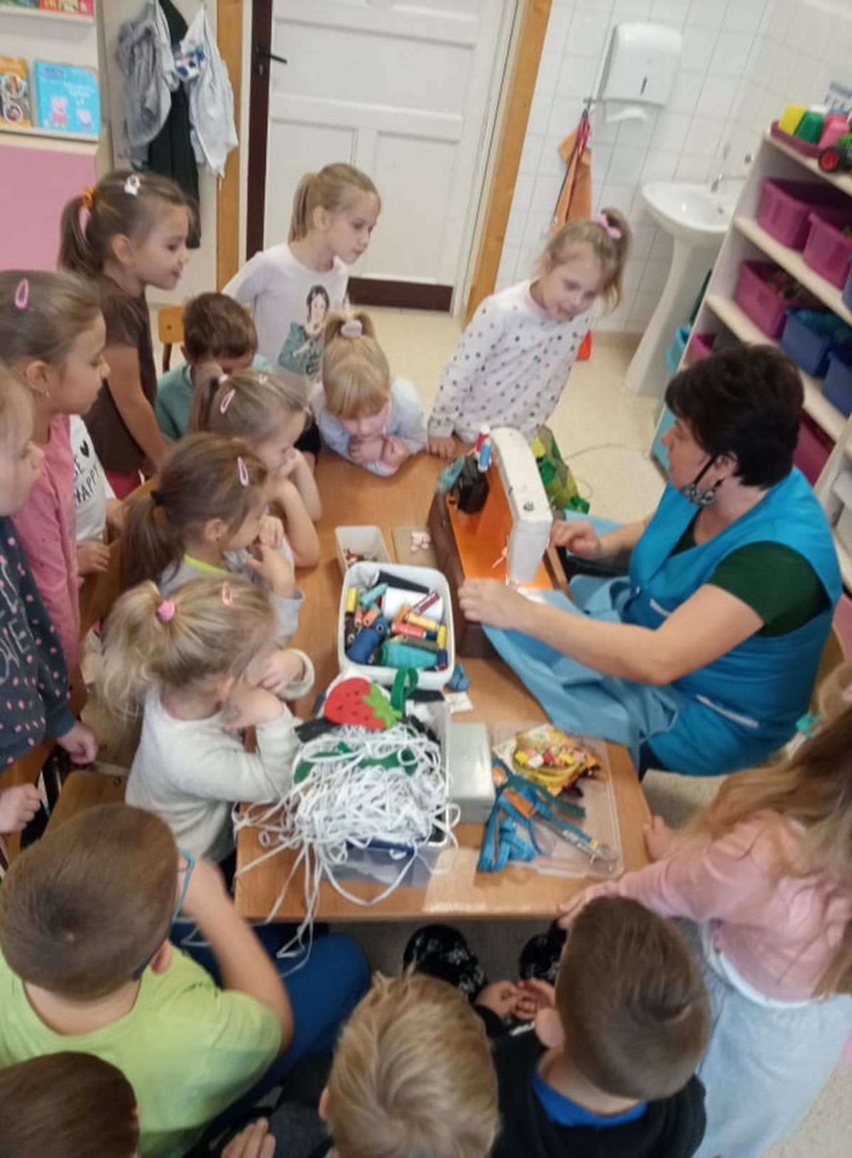 W ubiegłym tygodniu dzieci z naszego przedszkola poznały nowy zawód- krawcową. Z tej okazji niektóre grupy miały okazję gościć u siebie na zajęcia panią Marzenkę, która pracuje w naszym przedszkolu. Przedszkolaki oraz nauczyciele już nie raz mieli okazję podziwiać talent krawiecki naszej krawcowej. Tym razem każda z grup otrzymała uszytą torebkę na zakupy, którą dzieci będą mogły wykorzystać w czasie zabawy. Oprócz samego szycia, dzieci mogły poznać jakimi narzędziami posługuję się krawcowa na co dzień, poznały ich nazwy, mogły wszystkiego dotknąć. Starszaki z grupy Motylków ośmieliły się nawet zasiąść przy maszynie i szyć wspólnie z panią Marzenką. Bardzo dziękujemy pani krawcowej za wizytę i piękne podarunki.