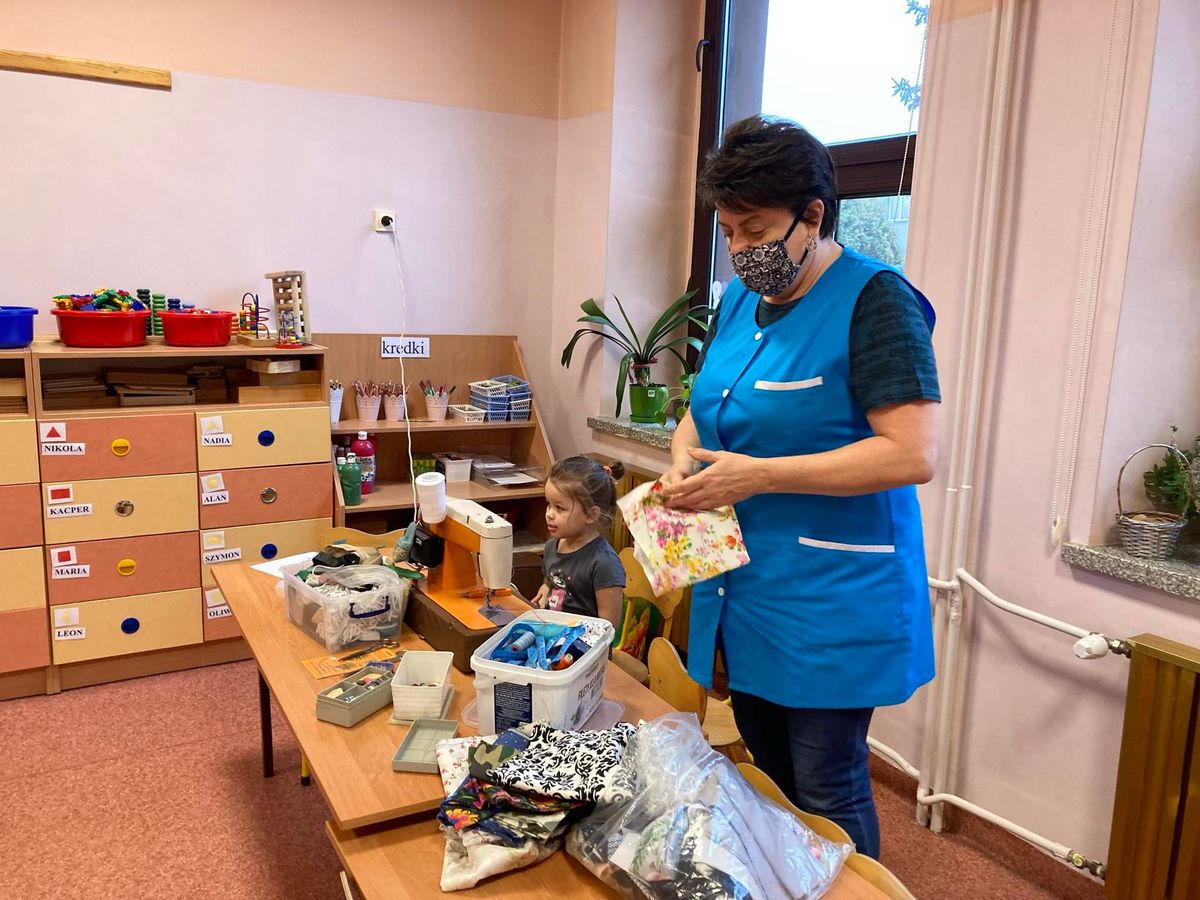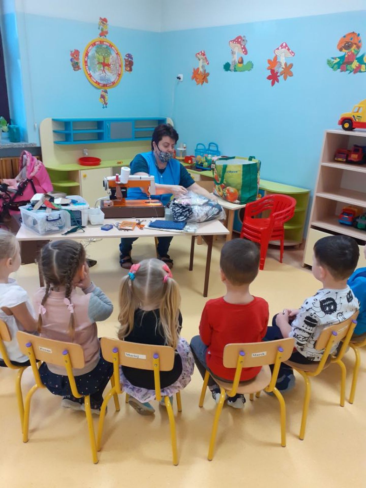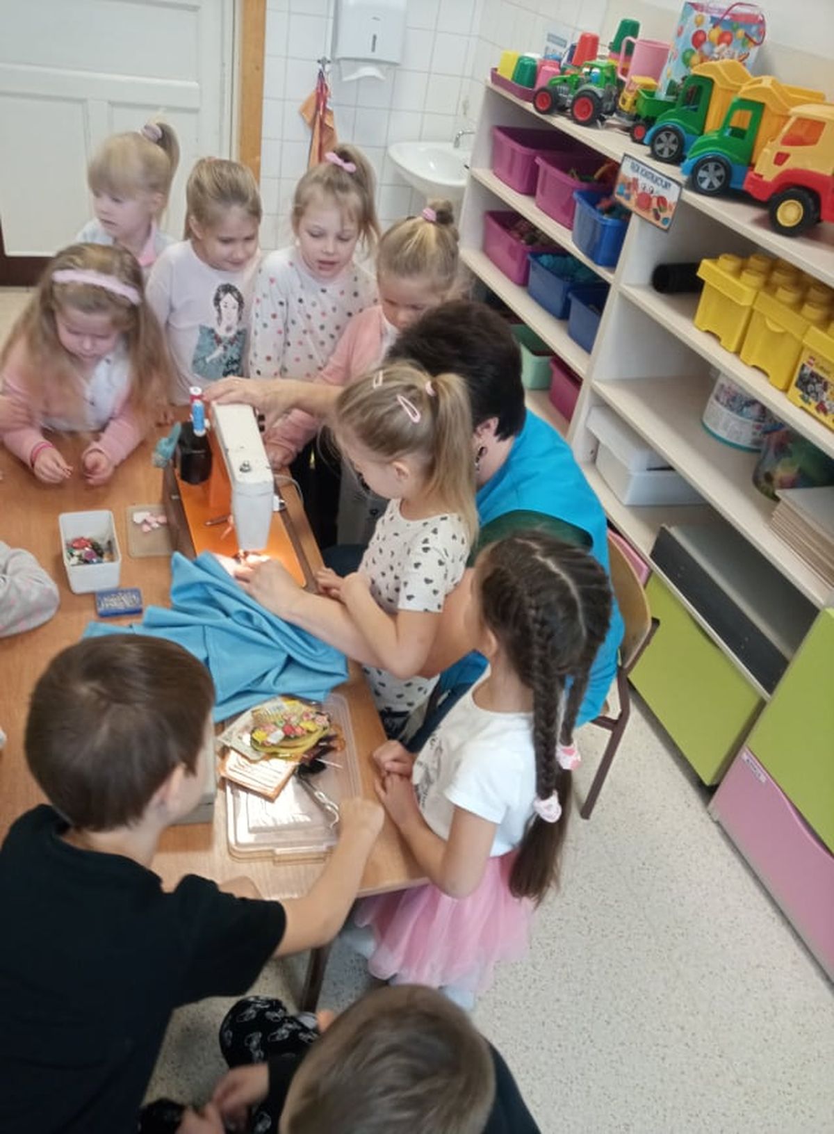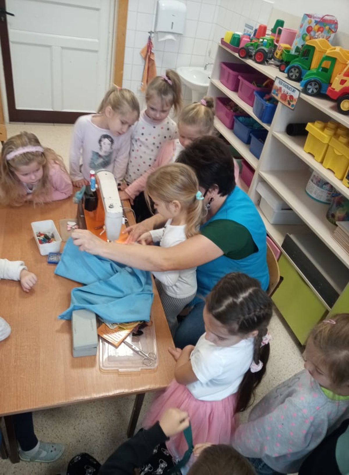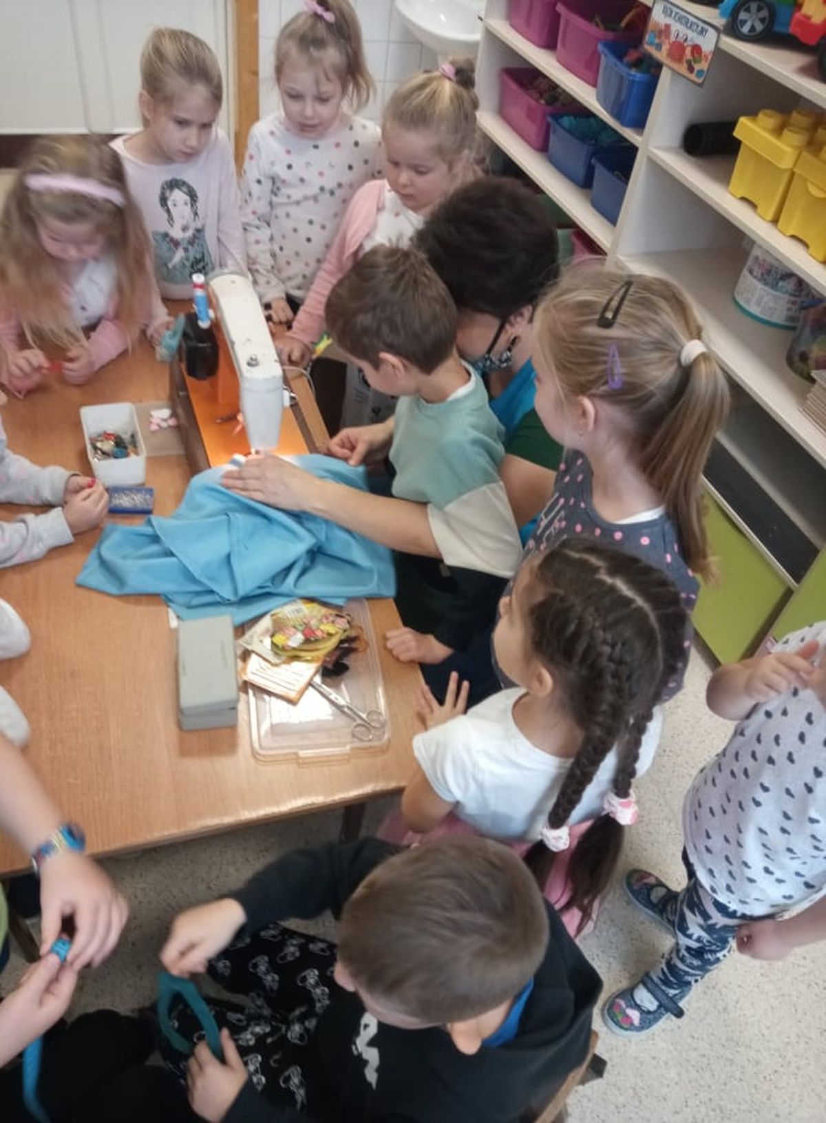 W ubiegłym tygodniu dzieci z naszego przedszkola poznały nowy zawód- krawcową. Z tej okazji niektóre grupy miały okazję gościć u siebie na zajęcia panią Marzenkę, która pracuje w naszym przedszkolu. Przedszkolaki oraz nauczyciele już nie raz mieli okazję podziwiać talent krawiecki naszej krawcowej. Tym razem każda z grup otrzymała uszytą torebkę na zakupy, którą dzieci będą mogły wykorzystać w czasie zabawy. Oprócz samego szycia, dzieci mogły poznać jakimi narzędziami posługuję się krawcowa na co dzień, poznały ich nazwy, mogły wszystkiego dotknąć. Starszaki z grupy Motylków ośmieliły się nawet zasiąść przy maszynie i szyć wspólnie z panią Marzenką. Bardzo dziękujemy pani krawcowej za wizytę i piękne podarunki.
