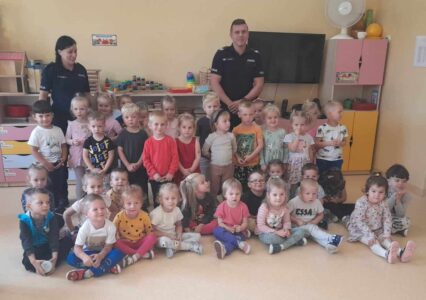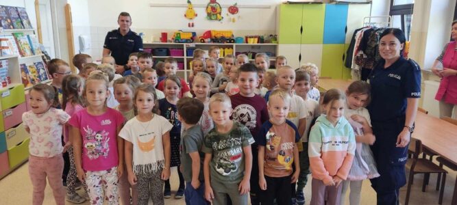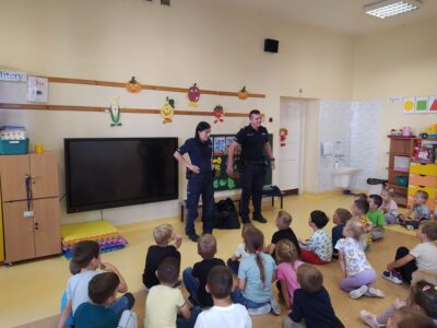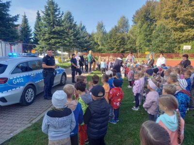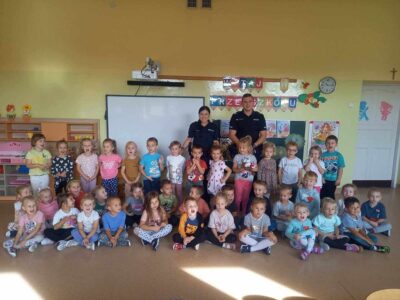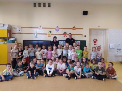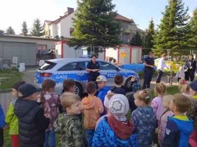 W czwartek 5 października w naszym przedszkolu odbyło się spotkanie przedszkolaków z policjantami.  Celem wizyty było przypomnienie zasad bezpieczeństwa. Goście przybliżyli dzieciom podstawowe zasady bezpiecznego poruszania się po drogach oraz zasady zachowania się podczas spotkania z nieznajomym. Nasze przedszkolaki dowiedziały się, jak bezpiecznie podróżować, jak ważne jest podróżowanie w foteliku samochodowym z zapiętymi pasami bezpieczeństwa. Nawiązali również do konieczności noszenia ubrań i obuwia posiadającego elementy odblaskowe. Dużym zainteresowaniem cieszyła się prezentacja ubioru i wyposażenia policyjnego, niezbędnego podczas wykonywania pracy policjanta. Największą atrakcją był radiowóz policyjny, który podjechał na boisko i dzieci mogły go obejrzeć. Dużo radości i emocji wzbudziło włączanie sygnałów alarmowych. Dzięki takim spotkaniom, dzieci darzą policję zaufaniem, oraz będą wiedziały, że  zawsze mogą zwrócić się do nich o pomoc.
