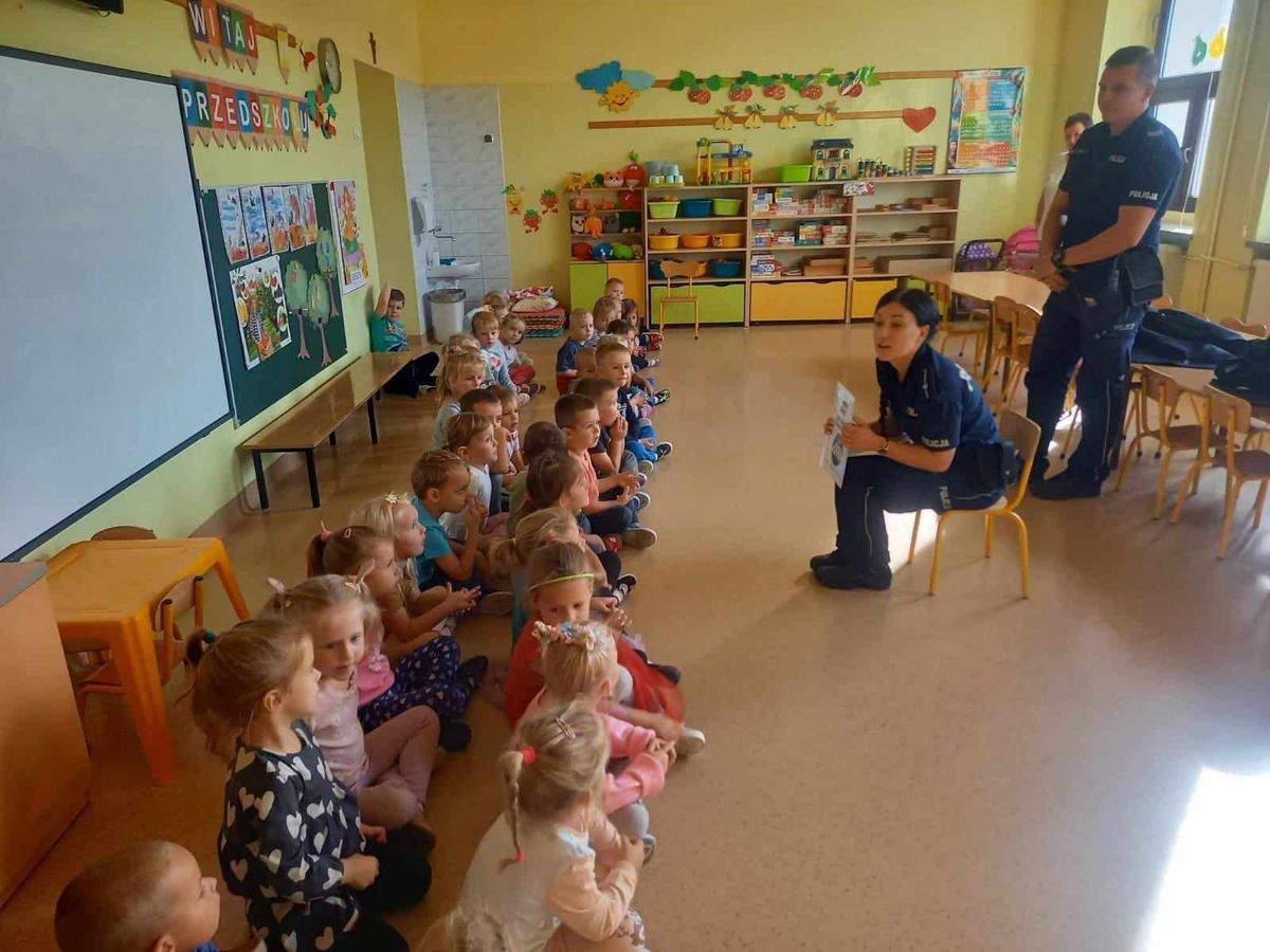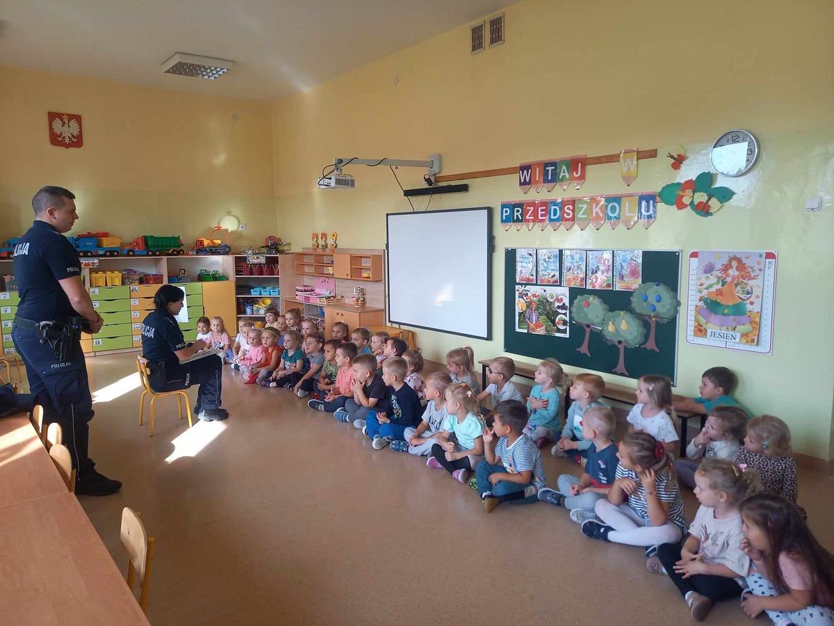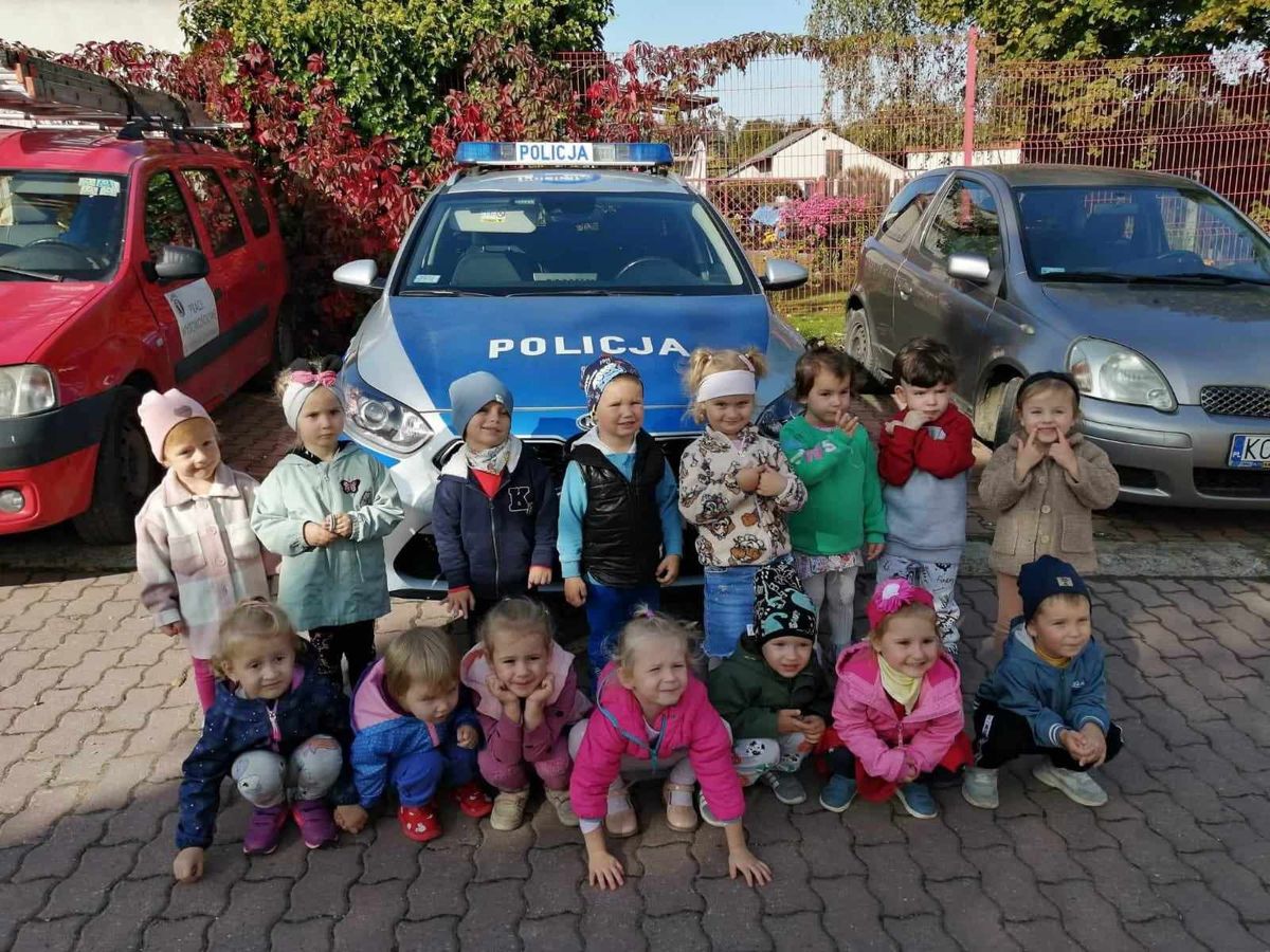 W czwartek 5 października w naszym przedszkolu odbyło się spotkanie przedszkolaków z policjantami.  Celem wizyty było przypomnienie zasad bezpieczeństwa. Goście przybliżyli dzieciom podstawowe zasady bezpiecznego poruszania się po drogach oraz zasady zachowania się podczas spotkania z nieznajomym. Nasze przedszkolaki dowiedziały się, jak bezpiecznie podróżować, jak ważne jest podróżowanie w foteliku samochodowym z zapiętymi pasami bezpieczeństwa. Nawiązali również do konieczności noszenia ubrań i obuwia posiadającego elementy odblaskowe. Dużym zainteresowaniem cieszyła się prezentacja ubioru i wyposażenia policyjnego, niezbędnego podczas wykonywania pracy policjanta. Największą atrakcją był radiowóz policyjny, który podjechał na boisko i dzieci mogły go obejrzeć. Dużo radości i emocji wzbudziło włączanie sygnałów alarmowych. Dzięki takim spotkaniom, dzieci darzą policję zaufaniem, oraz będą wiedziały, że  zawsze mogą zwrócić się do nich o pomoc.