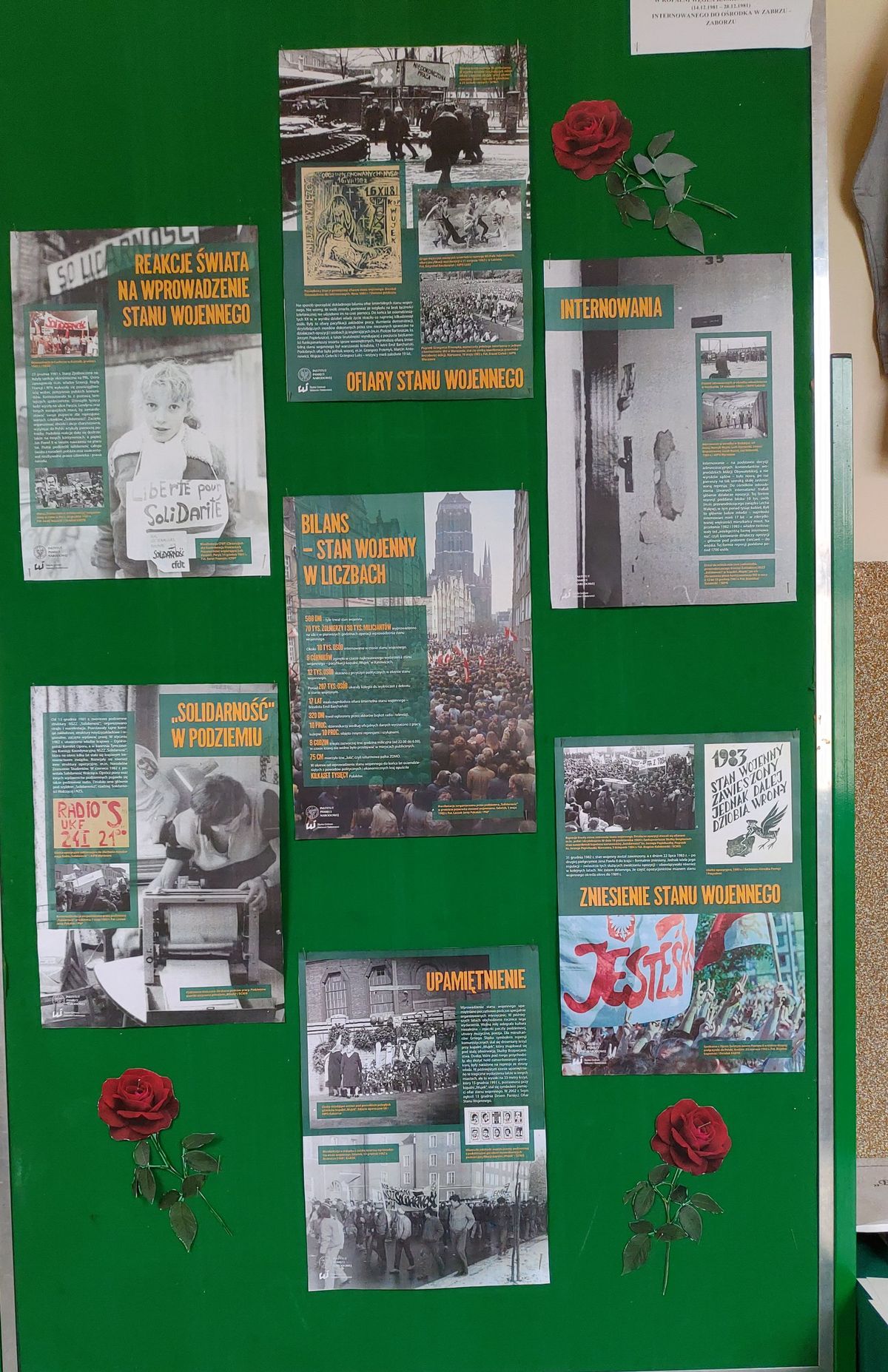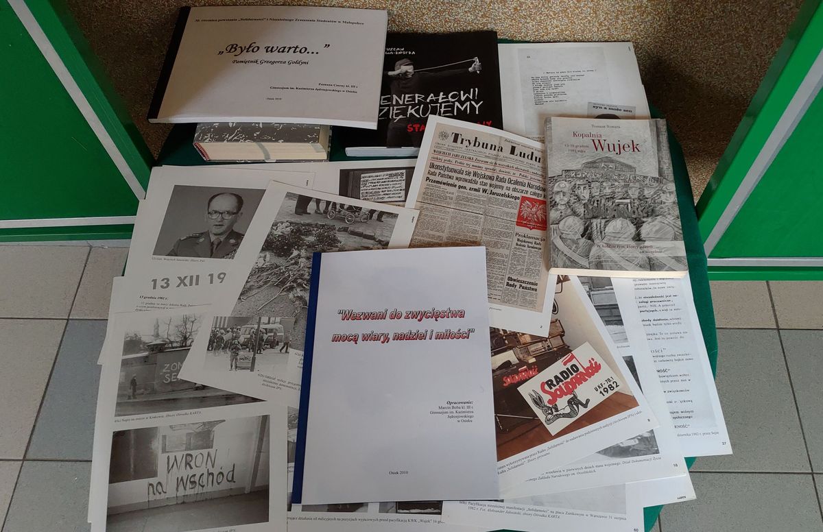 Na naszym szkolnym korytarzu uczniowie przygotowali wystawę o stanie wojennym, przyczynach jego wprowadzenia, przebiegu i konsekwencjach. Każdy zainteresowany może także obejrzeć kopie różnych dokumentów oraz bluzę pana Krzysztofa Młodzika – świadka stanu wojennego, górnika, który uczestniczył w słynnym 14- dniowym strajku w KWK „Piast”, działacza NSZZ „Solidarność”. Pan Krzysztof za uczestnictwo w strajku i działalność opozycyjną został internowany i przez pół roku przebywał w ośrodku internowania Zabrze – Zaborze. Oprócz zwiedzenia wystawy uczniowie na lekcjach historii wysłuchają też wiadomości i wspomnień o tamtych trudnych latach. Oczywiście w poniedziałek nie zabraknie również symbolicznej świecy, którą otrzymaliśmy od IPN w Krakowie. Pamiętajmy więc o tamtych tragicznych ale też i pięknych chwilach naszej historii bo jesteśmy to winni wszystkim tym, którzy poświęcili tak wiele w imię wolności.